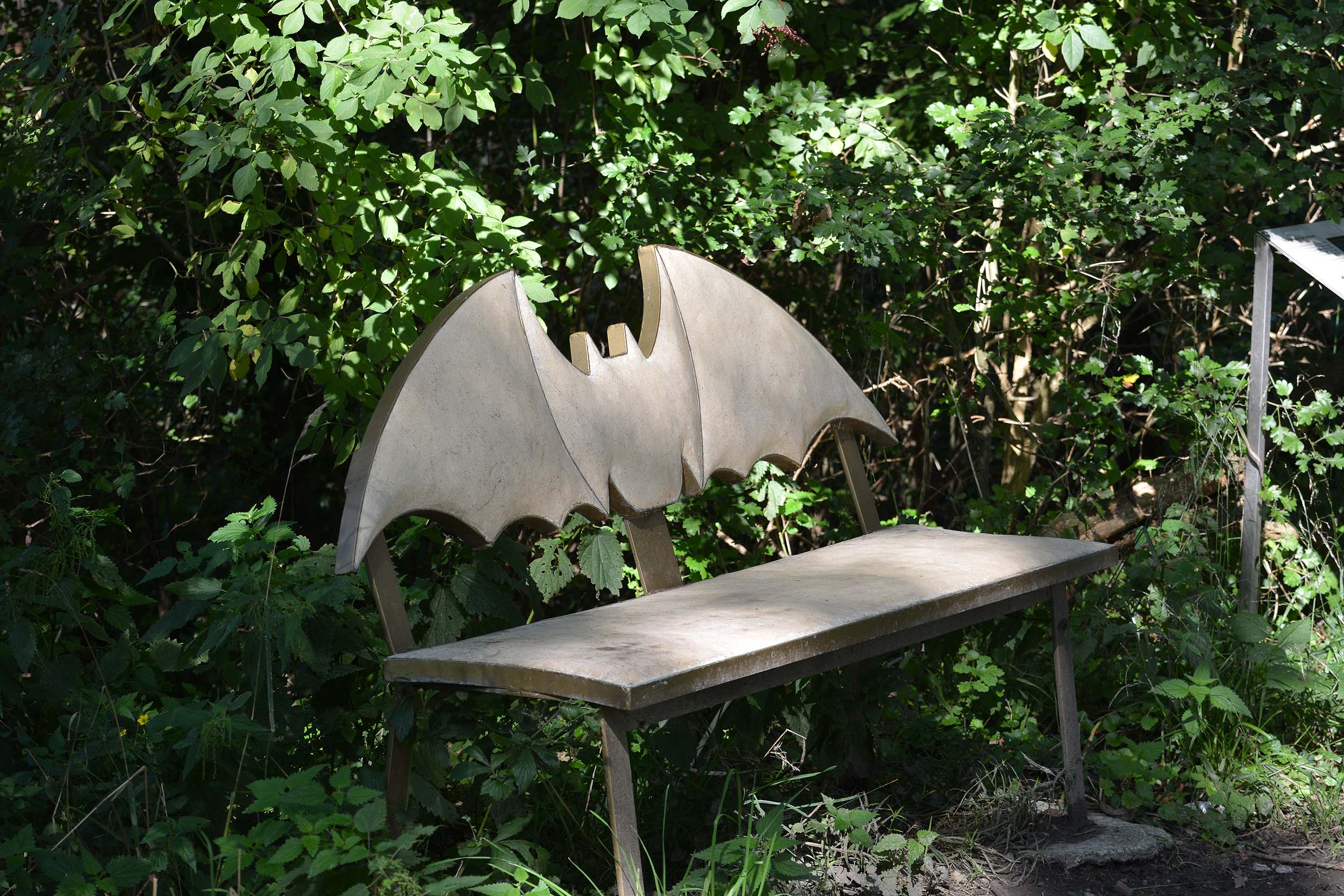 Wenn man das Schloss hinter sich lässt und auf der Südachse weiter nach Süden wandert, spaziert man geradewegs durch eine Allee und folgt einer Fledermaus bzw. dem Symbol einer Fledermaus. Passend hierzu wurde auch die Rückenlehne einer Sitzbank am Wegesrand in Fledermausform gestaltet. Batman lässt grüßen.