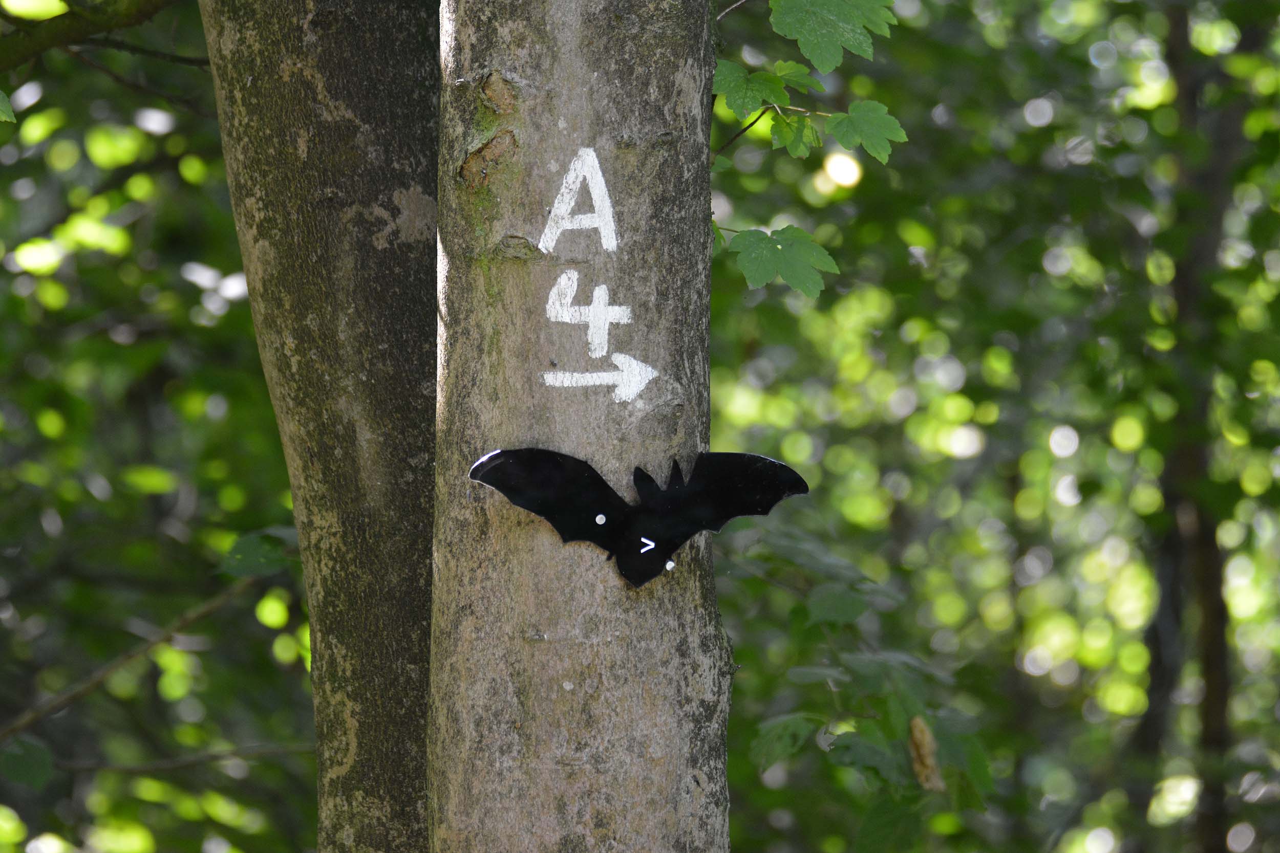 Automatisch wandert man in einen Wald hinein und ist über 500 Meter unterwegs, bis ein Abzweig nach rechts erscheint. Eine kleine versteckte Fledermaus weist uns hier den Weg. Würden wir geradeaus weiter gehen, würden wir den Schlosspark verlassen und später nach Südkirchen gelangen.