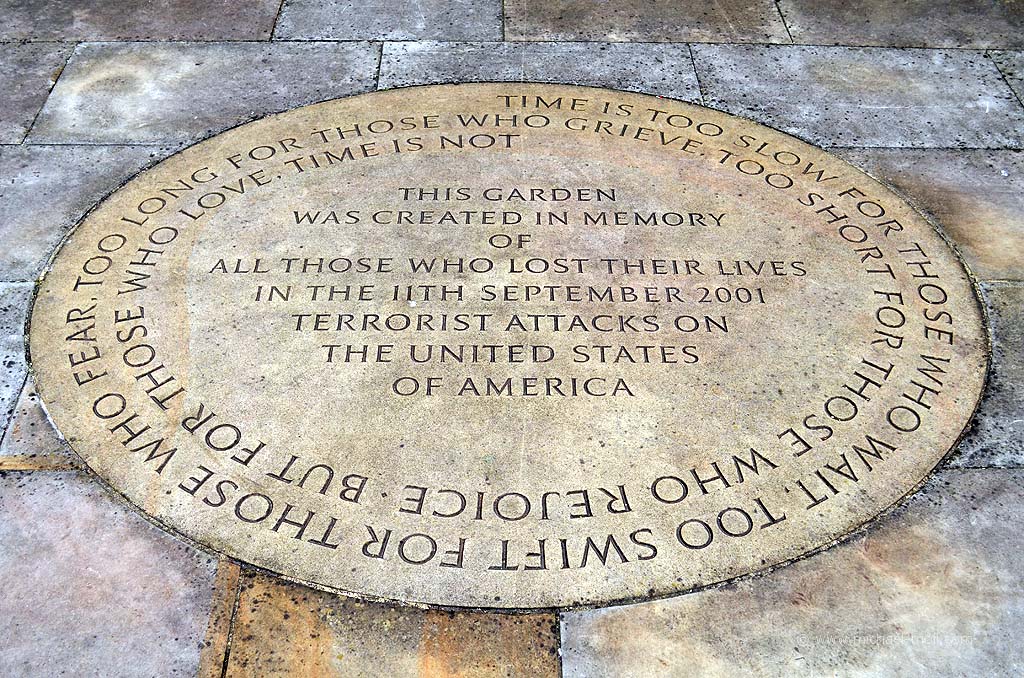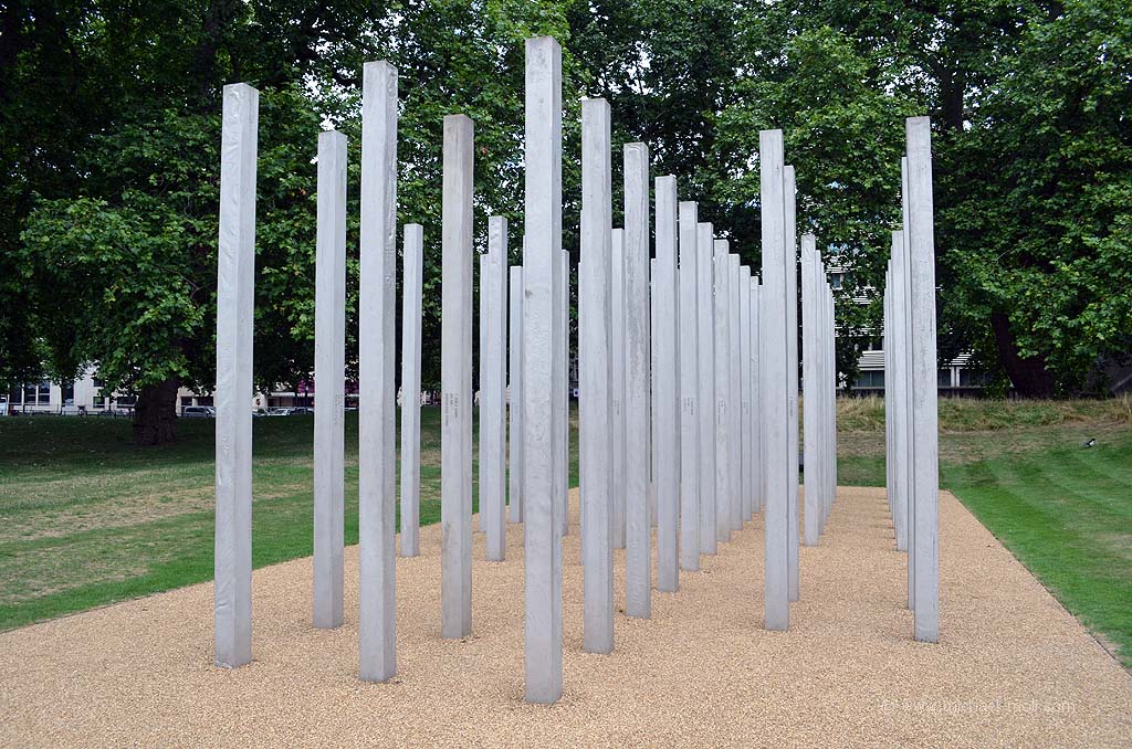 Durch den St. James-Park und dem Green Park gelangt man von dort aus fast automatisch zum Hyde Park. Neben einem Holocaust-Gedenkstein trifft man hier auf ein Feld mit 52 Stelen. Jede Stele steht für ein Opfer des 7. Juli 2005. Drei Bomben explodierten zeitgleich an einem Montagmorgen in der Londoner U-Bahn, eine weitere eine Stunde später in einem roten Doppeldeckerbus. Ein beklemmendes Gefühl, wenn man weiß, dass man an diesem Tag bereits mit der Tube unterwegs war – auf den Strecken, auf denen das geschah. Wo Menschen starben. Nur zwei Blocks östlich des Hyde-Parks gibt es eine weitere, deutlich kleinere Grünfläche. Sie nennt sich Grosvenor Square und erstreckt sich genau vor der amerikanischen Botschaft – noch, denn diese wird in den nächsten Jahren umziehen. Am östlichen Rand des Platzes erhebt sich eine kleine Gedenkstätte, die an den 11. September 2001 erinnert.