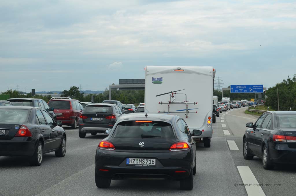 Also wird der Rest der Packerei, der noch übrig war, auf heute Morgen verschoben. Und auch einige private Mails, die schon länger auf Antwort warten mussten, sind noch am Morgen dran. So kommt es, dass wir erst gegen 13 Uhr aufbrechen. Viel später als wir es sonst gewohnt sind. Vollgepackt und gut gelaunt geht es auf die Autobahn 40, auf die Autobahn 43 und schon bald lassen wir das Ruhrgebiet hinter uns. Es folgt das Münsterland, Osnabrück und eine sich ewig ziehende Autobahn 1 bis Bremen.