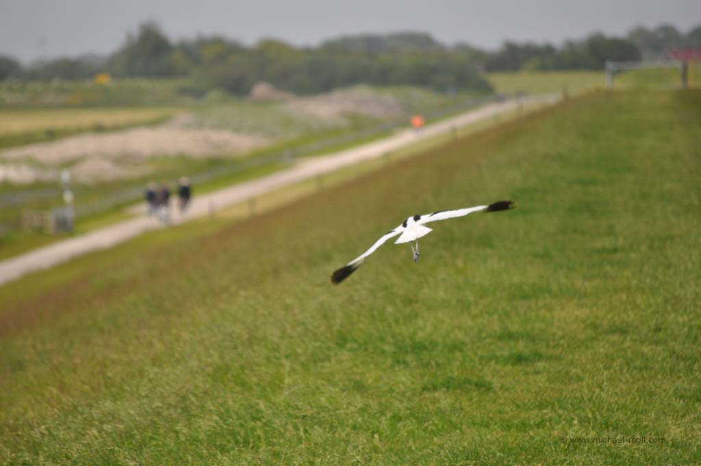 Auf dem Deich machten wir Begegnungen –natürlich– mit Schafen und mit Rauchschwalben, die im Kamikazeflug um uns herum kreisten. Erst später wurde uns klar, dass sie wahrscheinlich Jagd auf Insekten machten, die wir durch unsere Wanderung aufscheuchten. Neben den zahlreichen Möwen gab es zudem noch Austernfischer zu sehen. Eines dieser Vogelpaare brütete direkt am Stellplatz, wo wir deren Nahrungssuche für den Nachwuchs in Ruhe betrachten konnten.