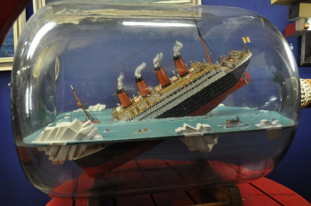 Dafür wanderten wir an einem der Tage über den frisch gemähten Deich nach Neuharlingersiel (Track). Unser GPS-Logger verriet uns später, dass es sich um eine Strecke von 7,6 Kilometern handelt, die wir mal eben hin und zurück gingen, nur um in Neuharlingersiel das dortige Buddelschiffmuseum zu besichtigen. Die kleine Ausstellung zeigt zahlreiche Schiffe, die irgendwie in Flaschen jeglicher Größe einzwängt wurden. Bei nicht wenigen Schiffen fragt man sich, wie man diese in die Buddel bekommen hat.