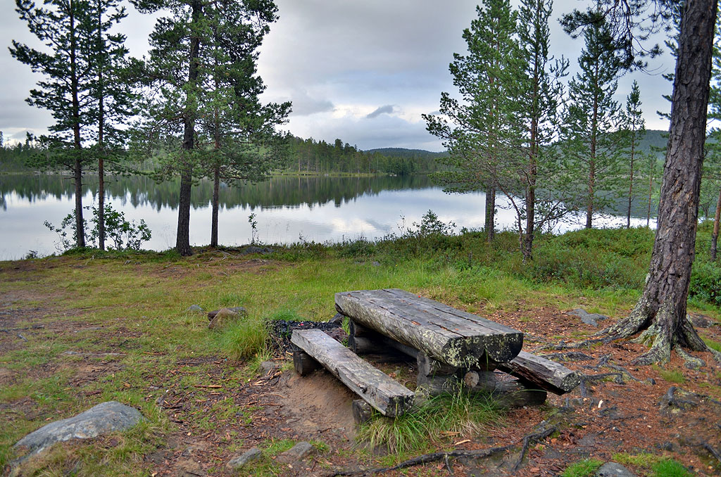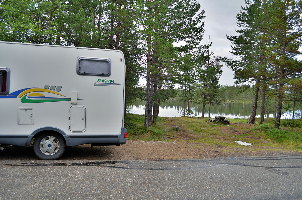 Der Grenzübergang nach Finnland war natürlich nicht der Rede wert. Ab sofort konnten wir wieder deutlich günstiger tanken und auch mit dem Euro bezahlen. Dafür hatten wir aber ziemliche Probleme, die Wörter zu lesen. Finnisch hat ja nun nichts mit dem gemein, was wir so kennen. Obwohl es eigentlich schnell ging, das ein oder andere Wort zu verstehen. Wenn man denn einmal wusste, was es bedeutet. Wir fuhren Richtung Inari, wo sich der gleichnamige große See befindet, der in Kreuzworträtseln immer abgefragt wird. Erstaunlicherweise fanden wir aber keine geeigneten Übernachtungsmöglichkeiten. Erst einige Zeit hinter Inari, also an der E75 gelegen, tauchte ein Rastplatz auf, der sich auch noch direkt an einem kleinen See befand. Ja, der war gut und bot Ruhe an.