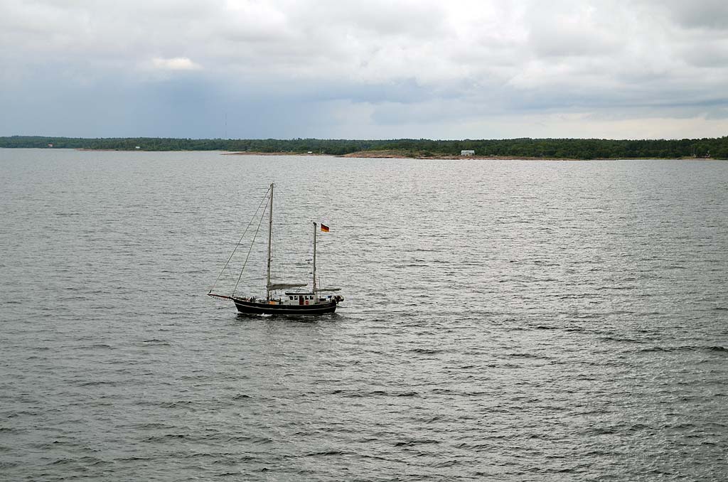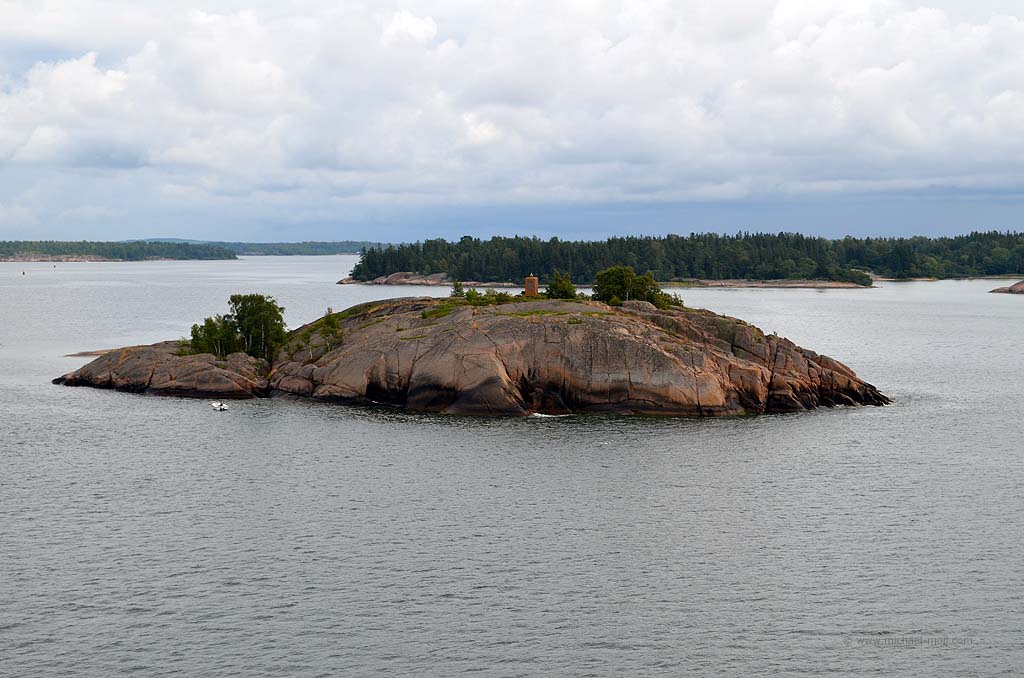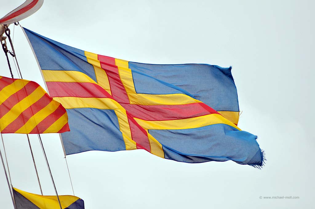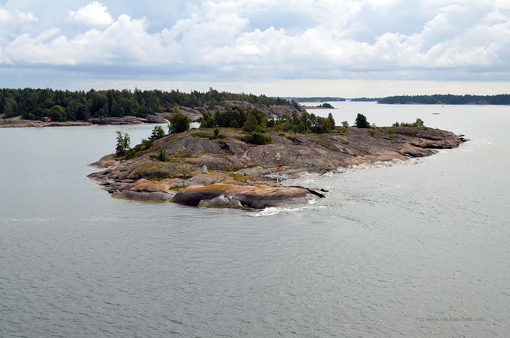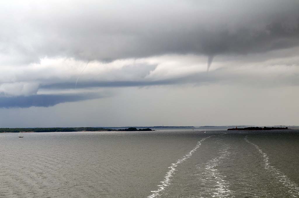 Die Fähre nach Mariehamn auf den Åland-Inseln sollte schon früh ablegen. Daher riss uns der Wecker aus dem gemütlichen Schlaf und wir fuhren schnell die sieben Kilometer bis zum Hafen in Turku. Dort hieß es natürlich warten auf das Einfahren. Wir waren einer der letzten, die auf das Schiff durften, aber Hauptsache, wir waren überhaupt drauf. Denn noch einen Tag bei Turku wollte ich nicht unbedingt verbringen. Auf dem Schiff gab es eine nette Uhr mit zwei Zeigern für die Stunde. Eine für die schwedische und eine für die finnische Zeit. Kein Wunder, denn Mariehamn ist für das Schiff nur eine Zwischenstation. Anschließend wird es weiter nach Schweden fahren. So weit wollten wir aber noch nicht. Die Ostsee war relativ ruhig, trotzdem unterquerten wir eine ziemlich dunkle Wolkendecke. Hierbei konnte ich beobachten, wie sich mehrere kleine Rüssel aus den Wolken herausbildeten und nach unten zogen. Es wirkte natürlich unheimlich und irgendwann traf einer der Rüssel die Oberfläche der Ostsee. Siehe da, plötzlich konnte ich einen kleinen Tornado sehen. Oder war es eine Wasserhose? Ich weiß es nicht. Aber es war schon beeindruckend.