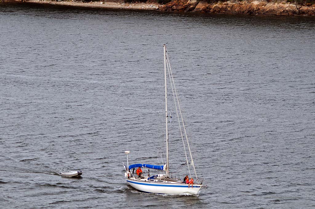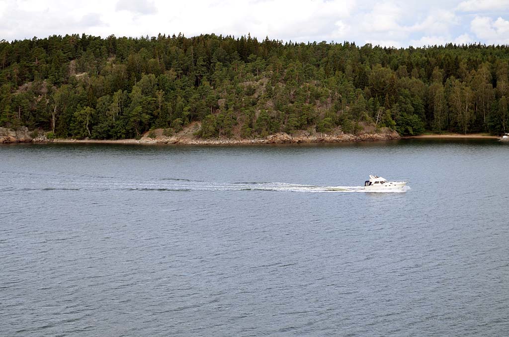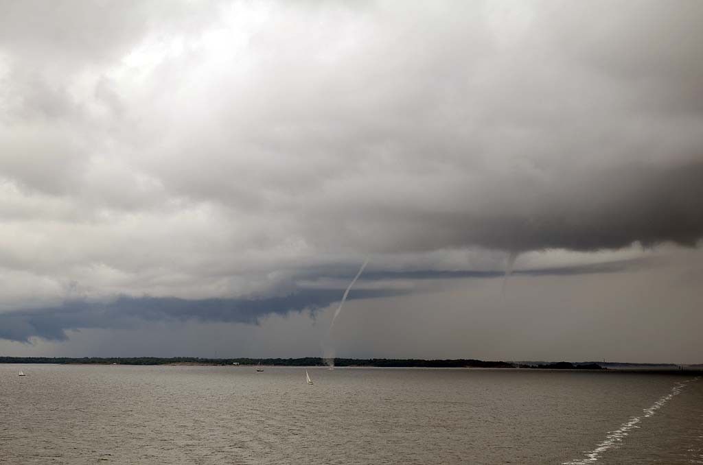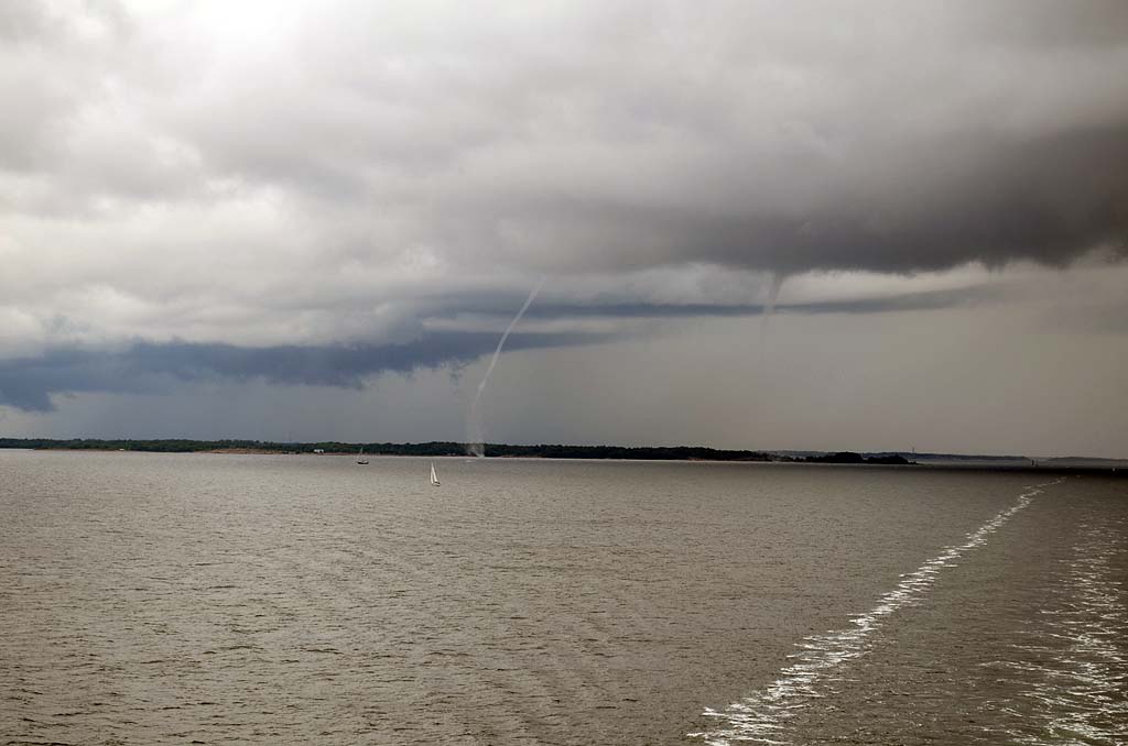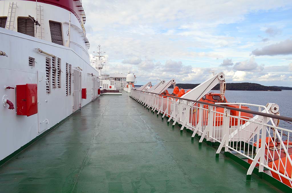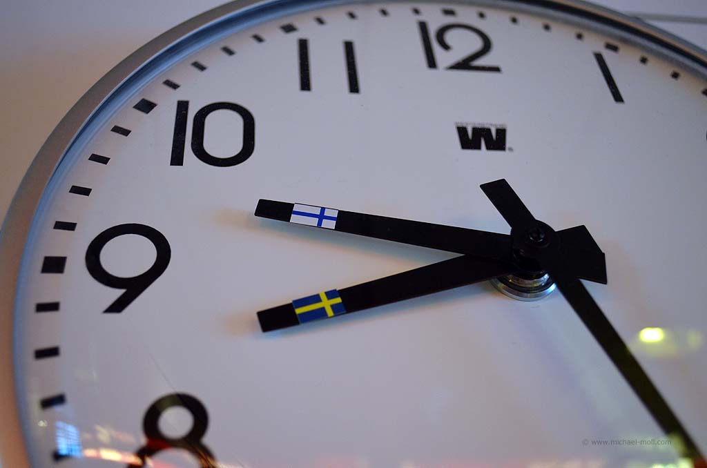 Die Fähre nach Mariehamn auf den Åland-Inseln sollte schon früh ablegen. Daher riss uns der Wecker aus dem gemütlichen Schlaf und wir fuhren schnell die sieben Kilometer bis zum Hafen in Turku. Dort hieß es natürlich warten auf das Einfahren. Wir waren einer der letzten, die auf das Schiff durften, aber Hauptsache, wir waren überhaupt drauf. Denn noch einen Tag bei Turku wollte ich nicht unbedingt verbringen. Auf dem Schiff gab es eine nette Uhr mit zwei Zeigern für die Stunde. Eine für die schwedische und eine für die finnische Zeit. Kein Wunder, denn Mariehamn ist für das Schiff nur eine Zwischenstation. Anschließend wird es weiter nach Schweden fahren. So weit wollten wir aber noch nicht. Die Ostsee war relativ ruhig, trotzdem unterquerten wir eine ziemlich dunkle Wolkendecke. Hierbei konnte ich beobachten, wie sich mehrere kleine Rüssel aus den Wolken herausbildeten und nach unten zogen. Es wirkte natürlich unheimlich und irgendwann traf einer der Rüssel die Oberfläche der Ostsee. Siehe da, plötzlich konnte ich einen kleinen Tornado sehen. Oder war es eine Wasserhose? Ich weiß es nicht. Aber es war schon beeindruckend.