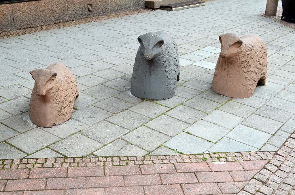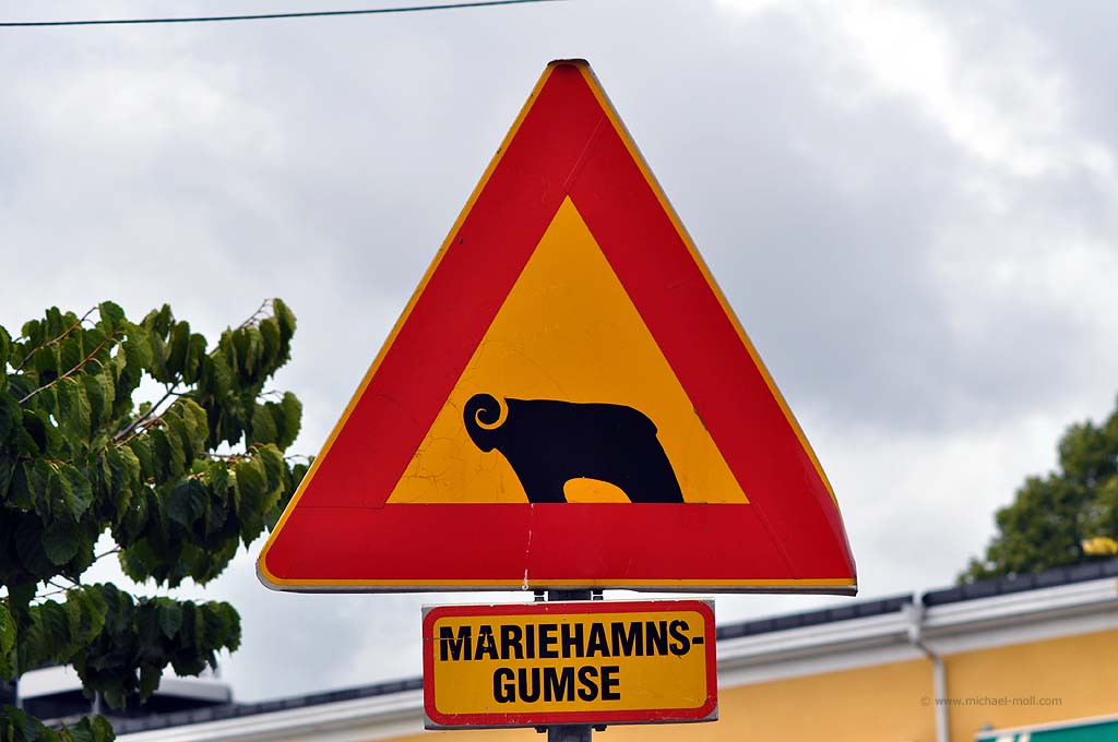 Ansonsten zogen während der Fahrt die zahlreichen kleinen Inselchen mit ihren Schärenküsten an uns vorbei. Es sah richtig schön aus und machte Vorfreude, die Inselgruppe kennen zu lernen. Nach unserer Ankunft parkten wir unser Wohnmobil im Zentrum von Mariehamn und schlenderten durch die kleine Hauptstadt. Zugegebenermaßen gab es nicht viel zu sehen. Die Hauptattraktion ist das Museumsschiff Pommern, auf dessen Besuch im Inneren wir aber gut verzichten konnten. Wir spazierten über die kurze und ruhige Fußgängerzone und fotografierten natürlich den Mariehamnsgumse – eine Widderskulptur, die gegen das eigene Verkehrsschild gerannt zu sein scheint.