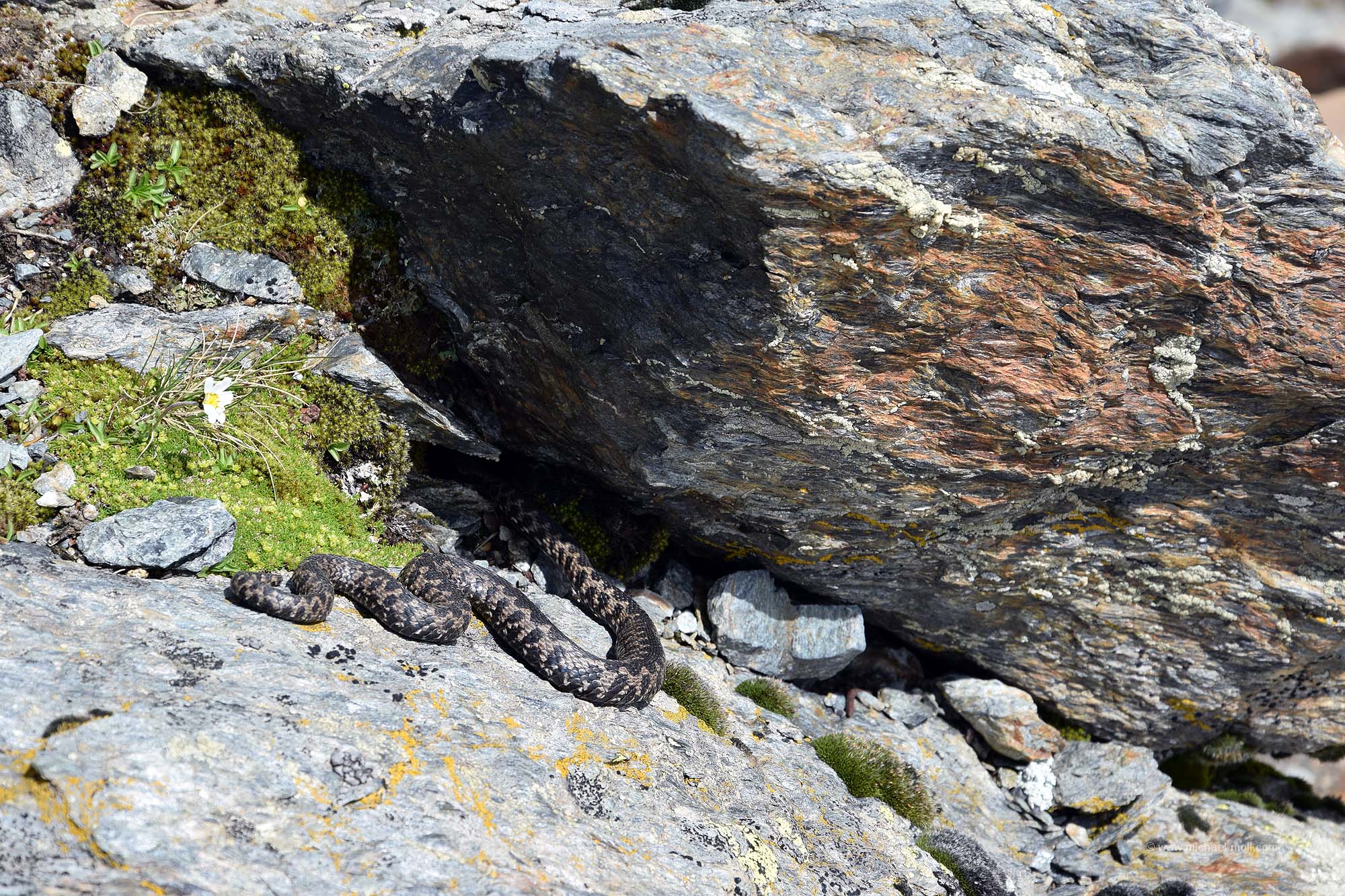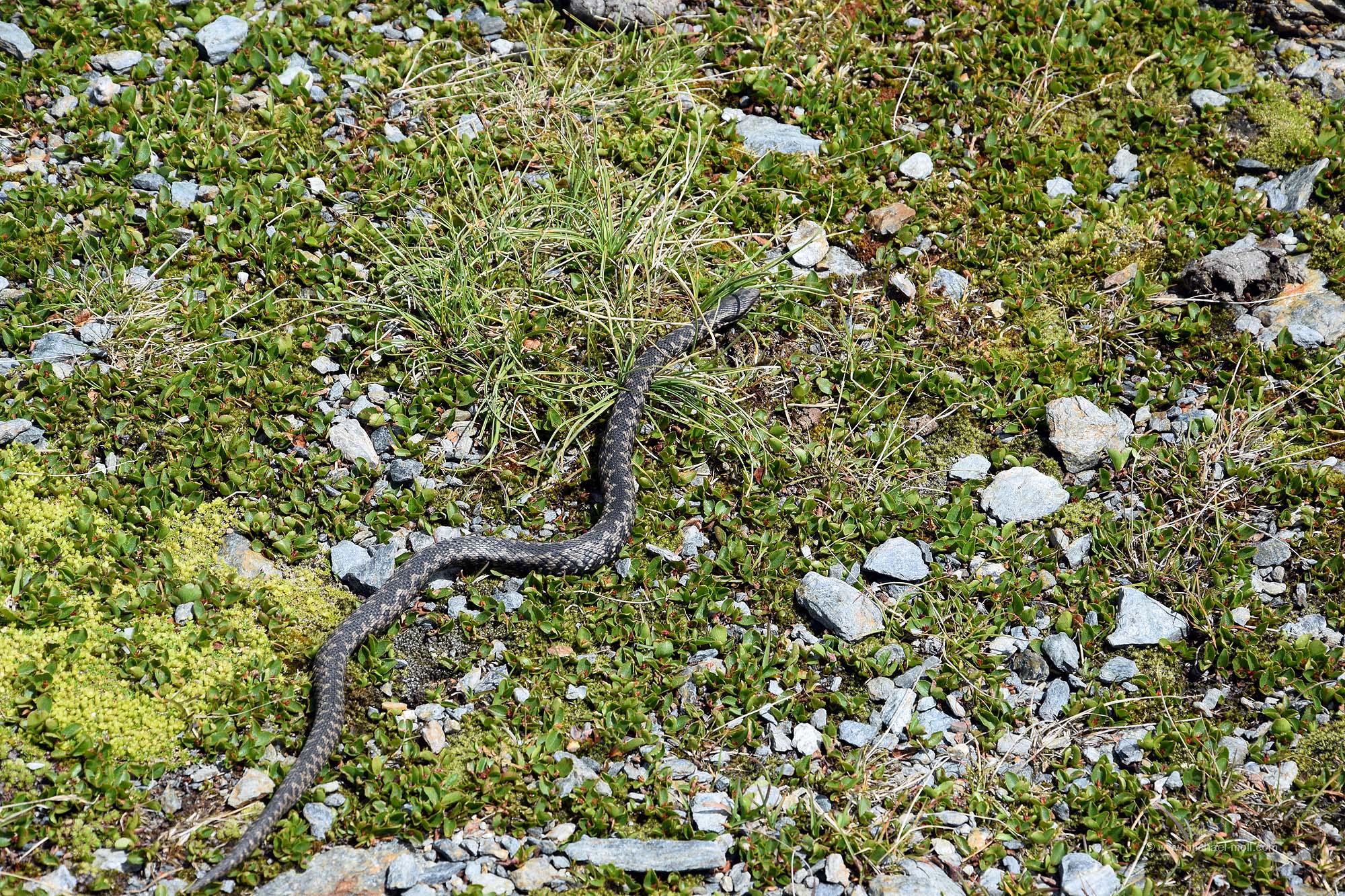 Und die zweite Schlange kreuzte zwar ebenfalls meinen Weg, hatte aber kaum Möglichkeiten, sich vor mir zu verstecken. Das war am Stilfser Joch in knapp 2.700 Metern Höhe. Ging zwar auch alles relativ flott, aber da hatte ich wenigstens noch die Chance zur Kamera zu greifen: