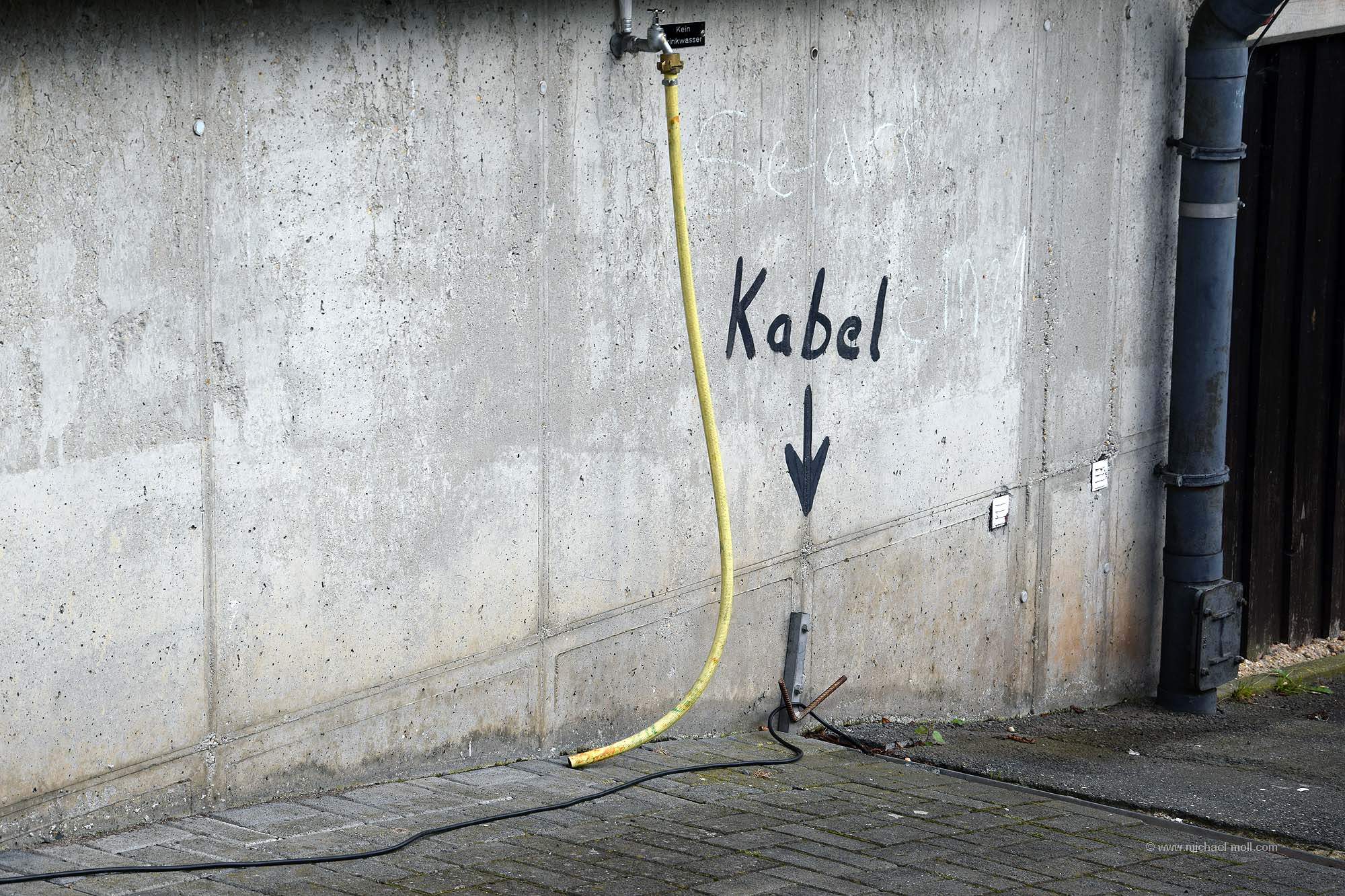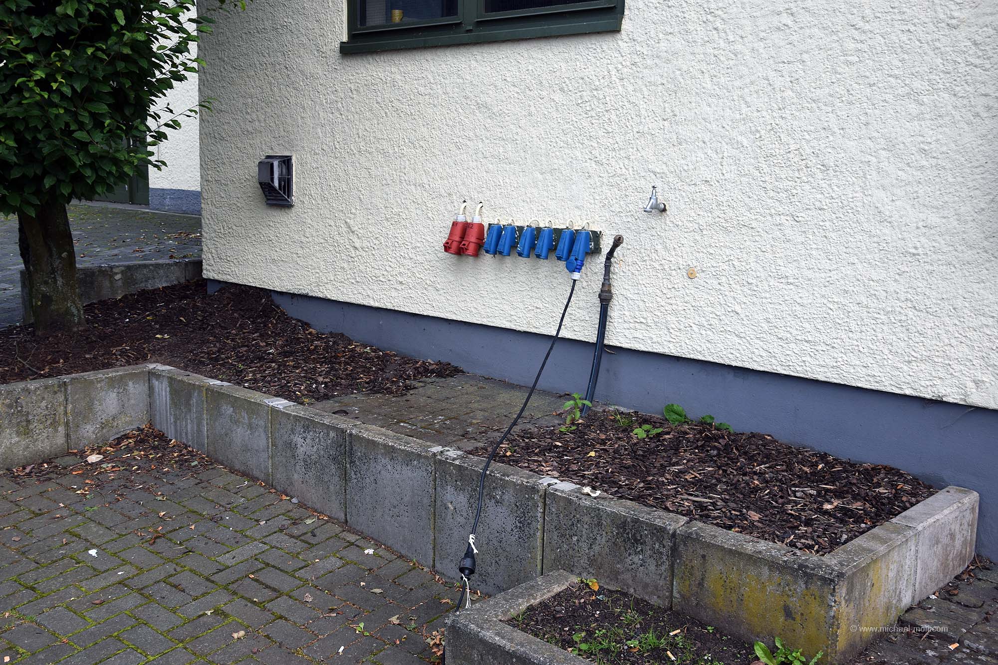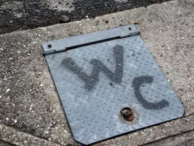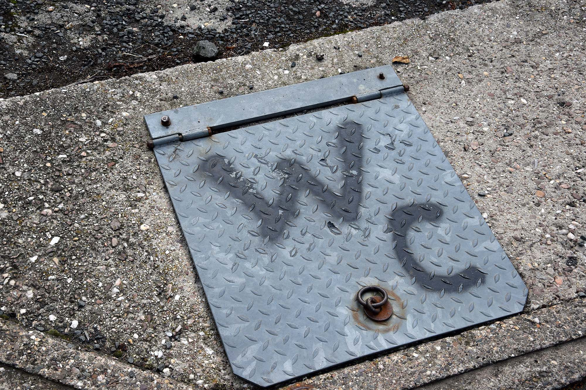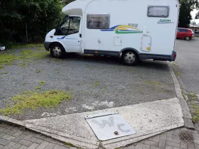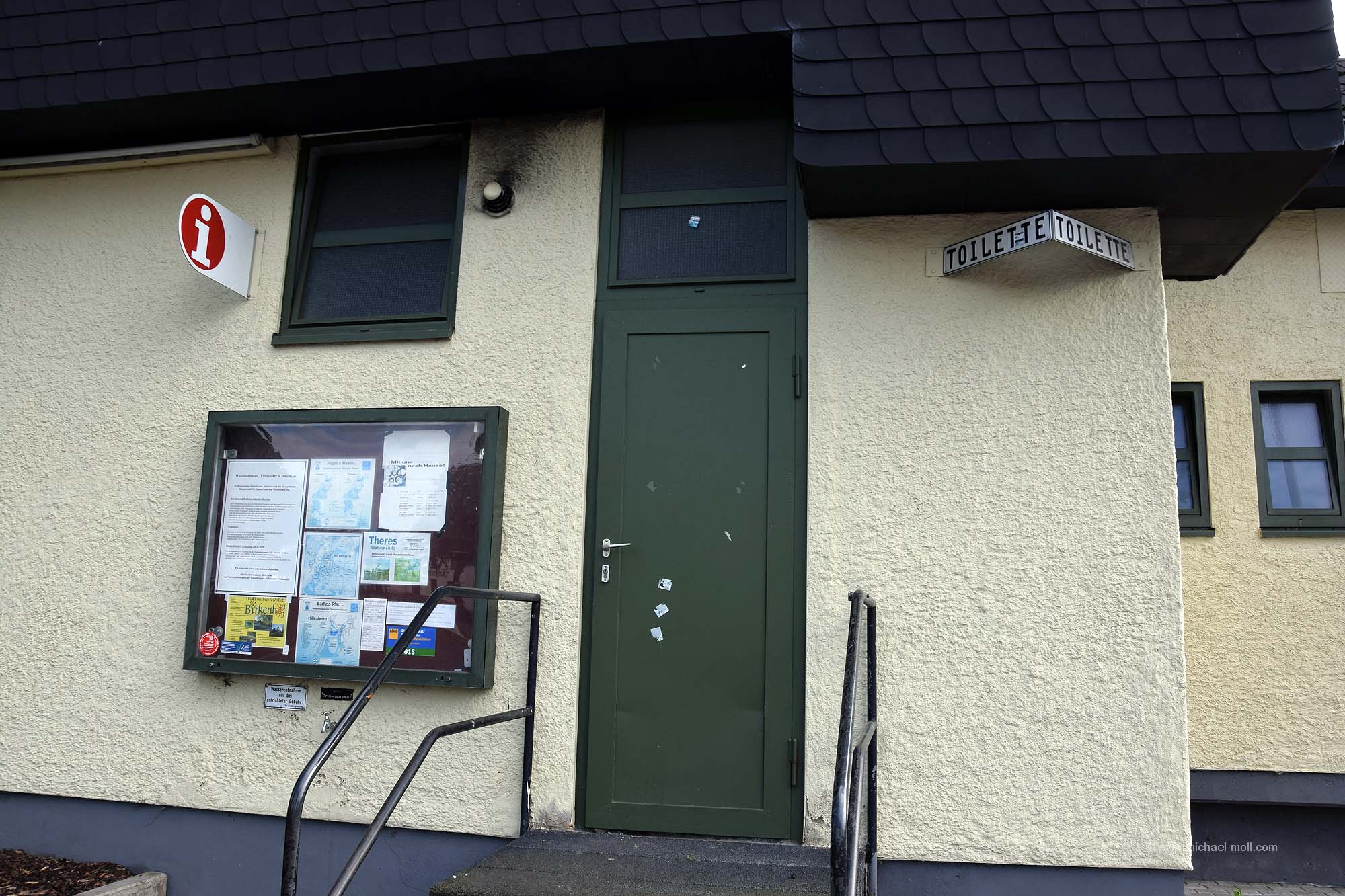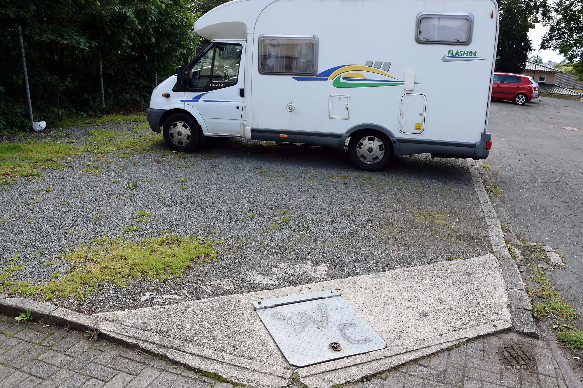 Einige Stellflächen befinden sich am Rande eines großen Parkplatzes. Gleich daneben gibt es ein Toilettenhäuschen, wo man sein Stromkabel anschließen kann. Zwischen den Stellflächen und dem Häuschen ist jedoch eine Zufahrt. Damit nun die Kabel nicht im Weg liegen, muss man es in einen Kabelschacht legen. Um das zu wissen, hat man einen großen Hinweis an die Wand geschrieben. Und genauso einen Hinweis gibt es am Gullydeckel, wo man die Toilette entleeren kann.