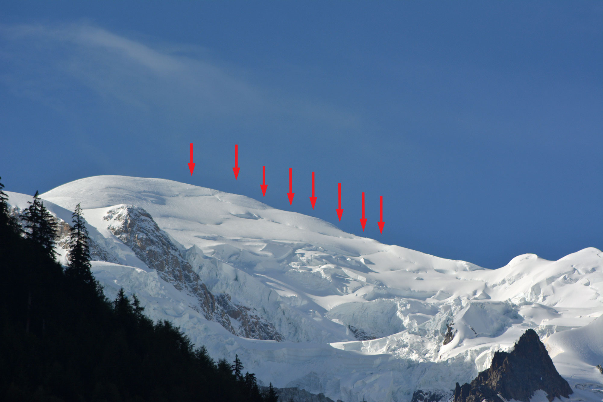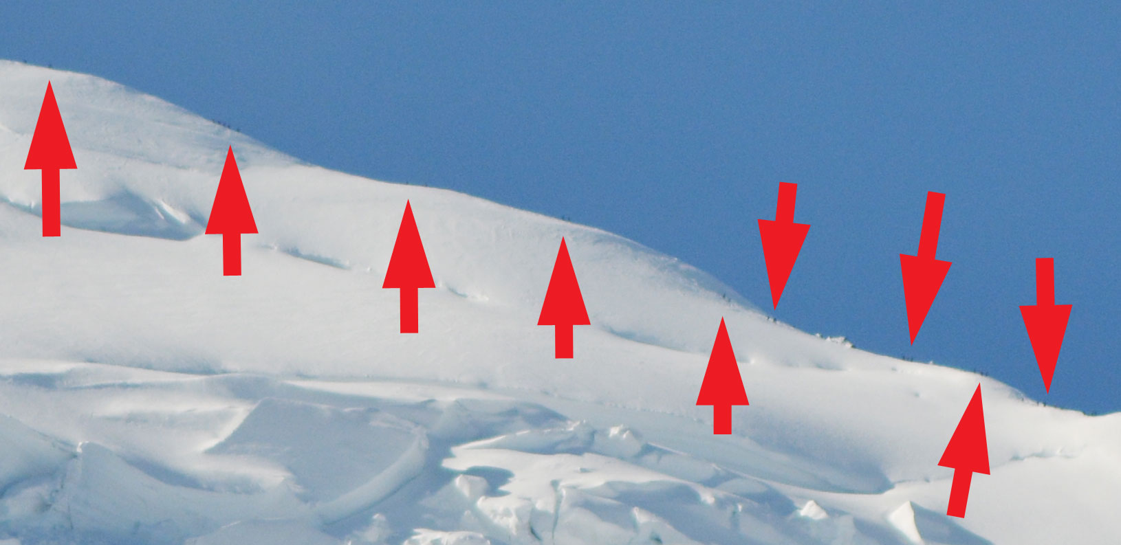 Bis auf das Einfügen der Pfeile habe ich an dem verkleinerten noch nichts gemacht. Doch wenn ich aus der 100%-Ansicht einen Teil des Bildes ausschneide, dann sieht man deutlich Menschen auf dem Weg zum Gipfel: