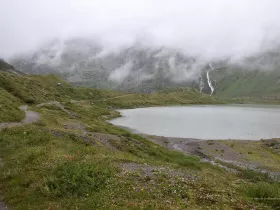 Westlich vom Pass erkennt man deutlich den kleinen Steinsee. Südlich davon wiederum den Steingletscher.