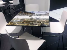 Großer Globus mit zig Bildern im Eingangsbereich.