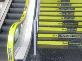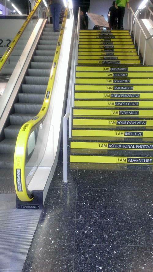 Über diese Treppen kommt man dann in den Hauptgang, von wo aus die Zugänge zu den Messehallen abzweigen.