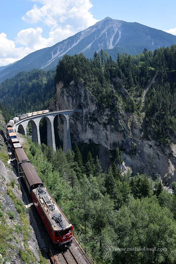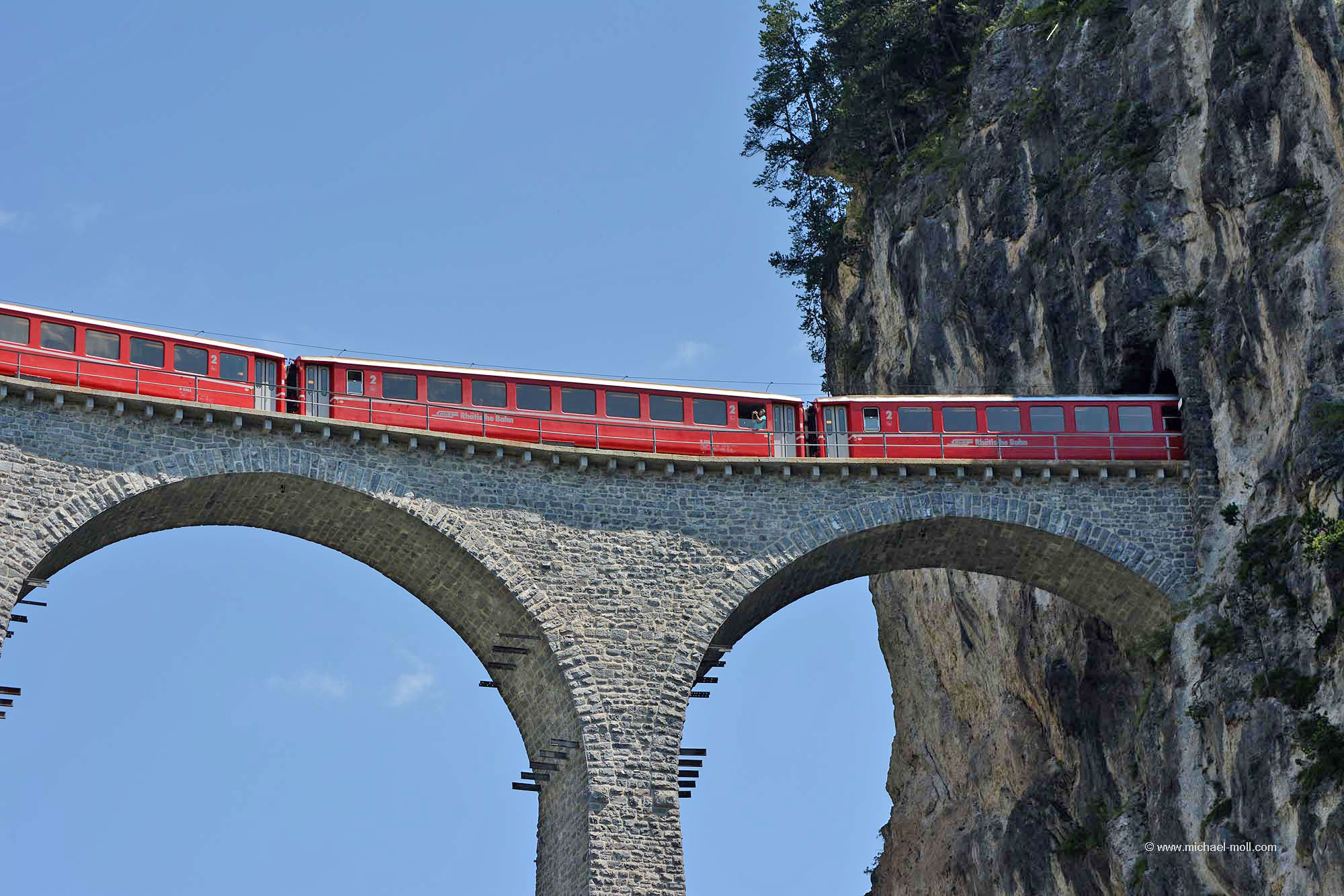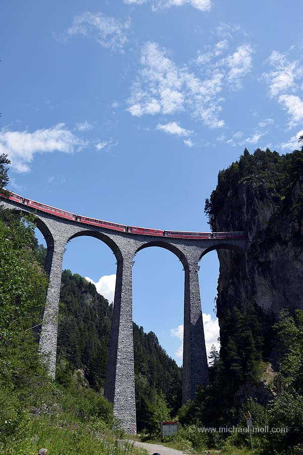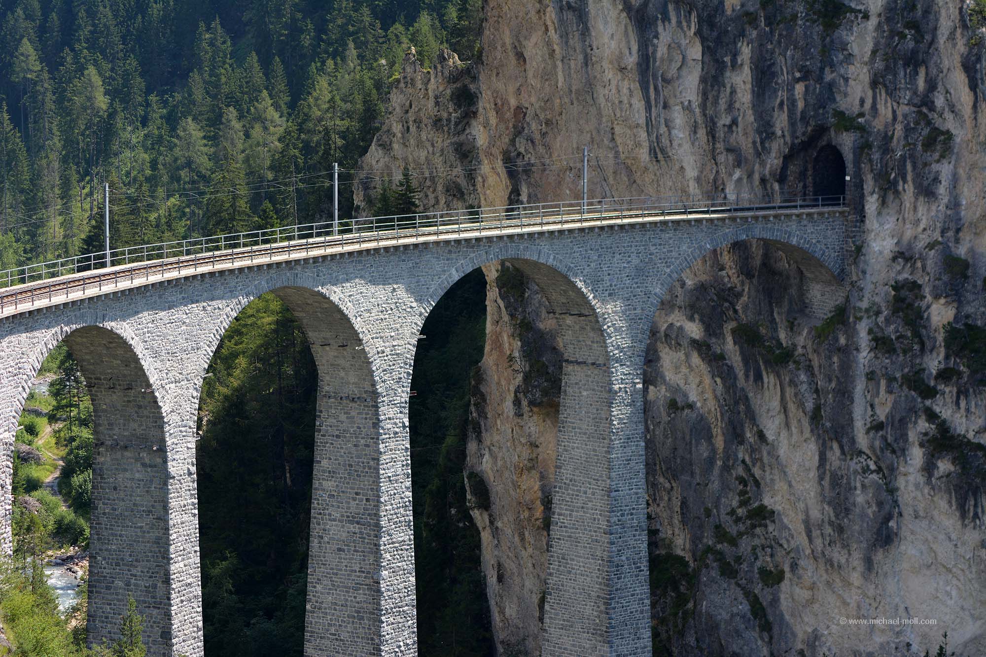 Im Sommer bin ich mit dem Bernina-Express gefahren. War ziemlich klasse, werde später noch mehr darüber schreiben. Der Zug überquert dabei auch das Landwasserviadukt, was als eines der Highlights auf der Bahnstrecke gilt. Denn der Zug fährt aus einem Tunnel heraus und befindet sich direkt nach dem Tunnel auf dem Viadukt. Bei der Fahrt in die andere Richtung fährt man also über die Brücke und eigentlich direkt auf eine Felswand zu (etwas überspitzt dargestellt).