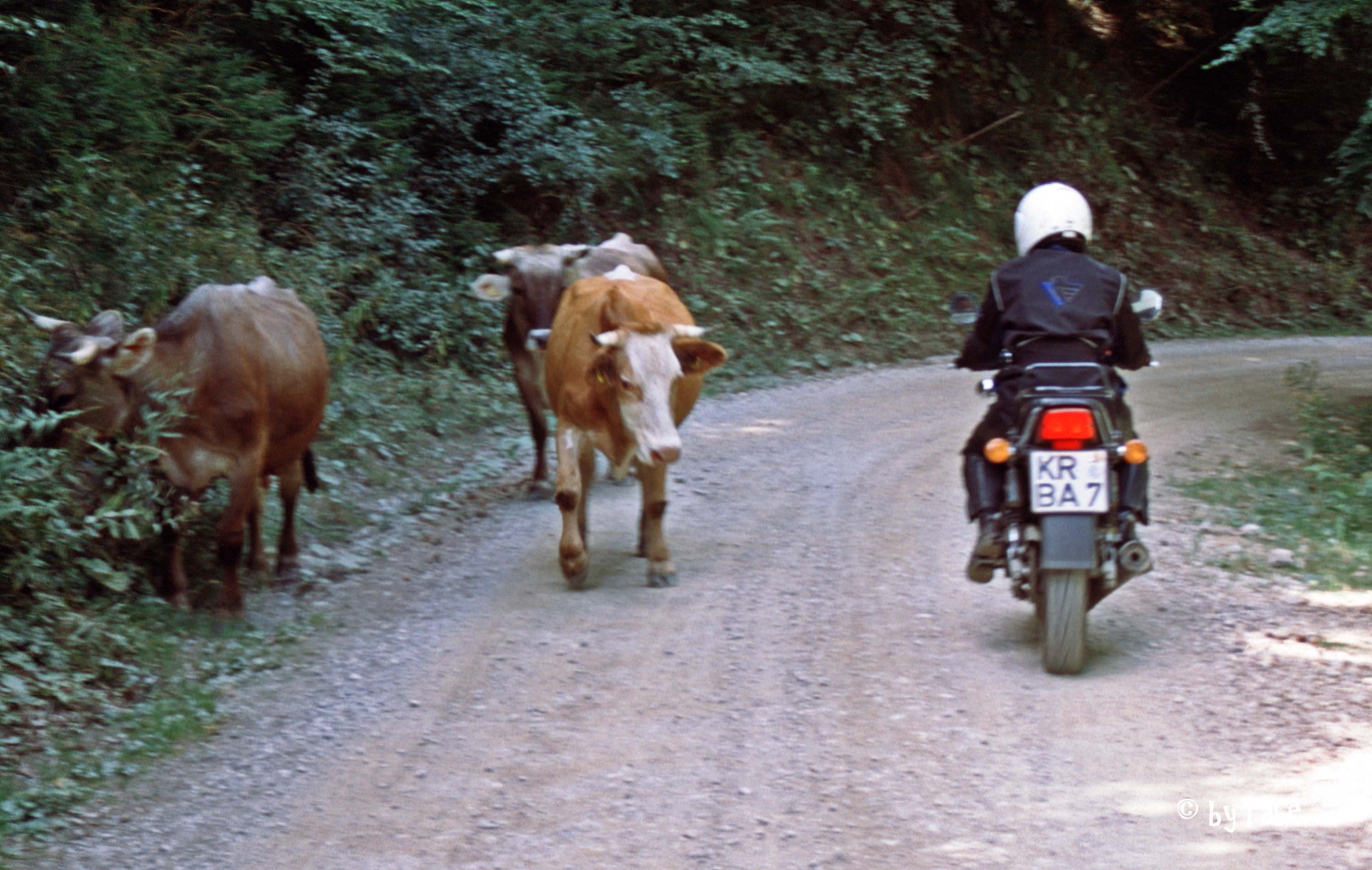 Trotzdem waren wir häufig ganz allein unterwegs, zumindest wenn wir das auf uns Menschen bezogen. Freilaufende Kühe trafen wir allerdings des Öfteren an in diesen verlassenen Gegenden, die zum größten Teil jedoch keine Notiz von uns nahmen. Ruhig und unbeirrt zockeln sie über die Straße, wenn man den Motor nicht gerade einmal aufheulen lässt.