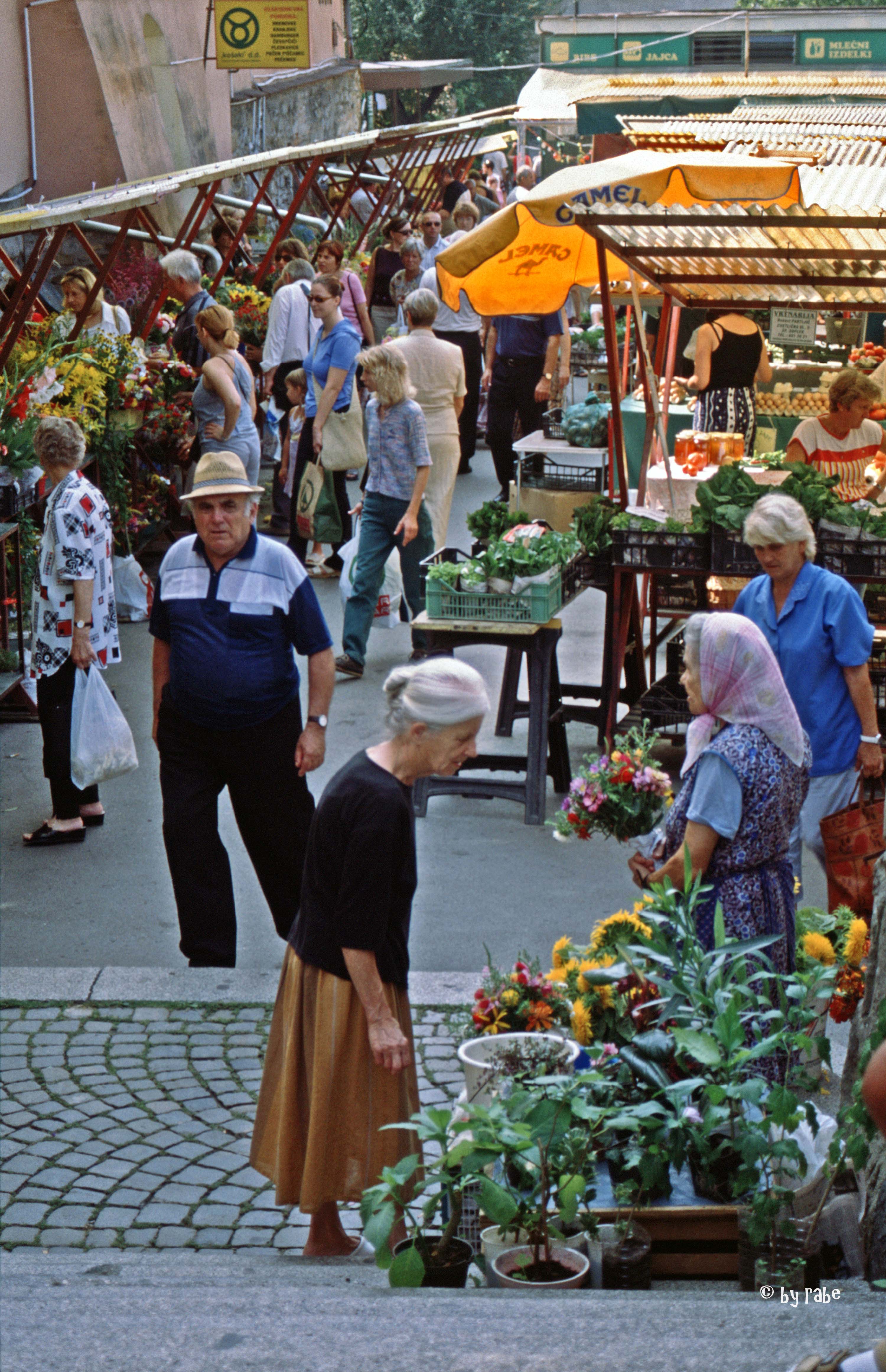 Selbst in den wenigen Großstädten, die wir anfuhren, trat er zutage. Wie hier auf dem Wochenmarkt in Maribor.