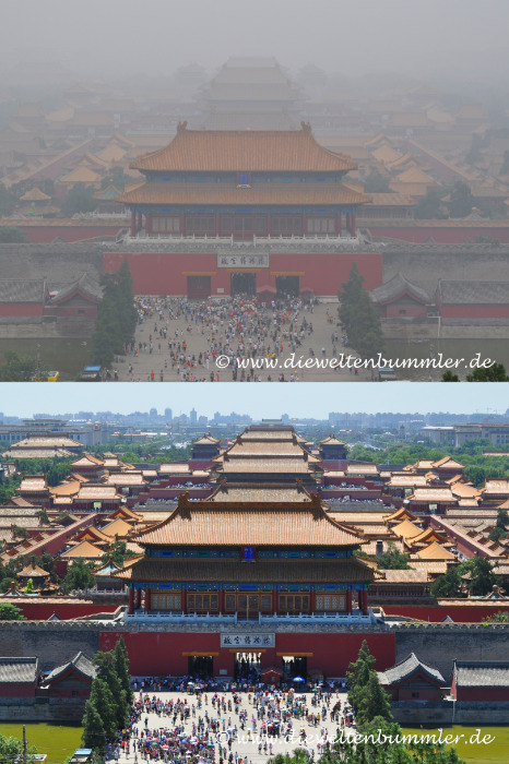 Aufgenommen habe ich diese beiden Bilder im August 2010 mit einem Abstand von zwei Tagen. Zu sehen ist die Nordseite der Verbotenen Stadt, aufgenommen vom einem Hügel im Jingshan-Park. Ich denke, die Bilder sprechen für sich.