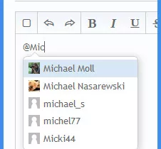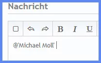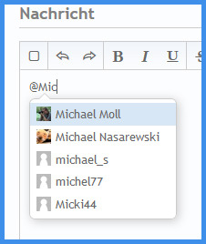 Man schreibt das @-Symbol und beginnt gleich dahinter ohne Leerzeichen mit dem Namen des Users. Wichtig ist natürlich der Username, nicht der reale Name. Im Bildbeispiel soll der User "Michael Moll" angeschrieben werden. Man sieht, dass nach dem dritten Buchstaben eine Auswahl von Usernamen erscheint, die mit "Mic" beginnen:![]()