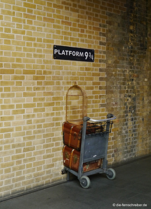 Daher jetzt der Nachtrag: Globus hat natürlich recht, es ist King's Cross in London...... mit seinem berühmten fiktionalen Bahnsteig 9 3/4 aus "Harry Potter". Völlig deplatziert wirkend (so empfinde ich es zumindest) steckt denn auch in einem Teil der Bahnhofshalle in einer Wand der "halbe Gepäckwagen", mit dem Harry bekanntermaßen durch das Mauerwerk "diffundiert", um zu Gleis 9 3/4 mit Ziel Hogwarts zu gelangen: