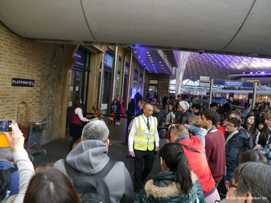 Und so sieht das dann in der Bahnhofshalle von King's Cross in natura aus: Die "Gepäckwagen-Attraktion" wird von Security bewacht und in einem Halbkreis mit gebührendem Abstand um den Gepäckwagen herum stehen die Menschen in langen Schlangen hinter Absperrungen, um für ca. 9 £ pro Person am Gepäckwagen mit wehendem Gryffindor-Schal um den Hals von einem Profi-Fotografen abgelichtet zu werden... für meine Verhältnisse ein wenig zu viel Hype und Kommerz... aber: jedem das Seine... und die riesige Fangemeinde spricht ja Bände!