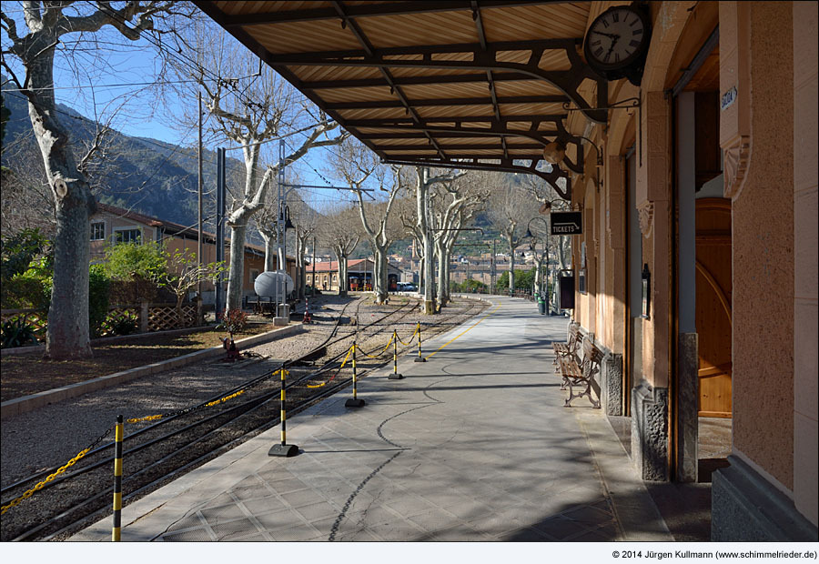 natürlich hast du recht, es ist der Endbahnhof der 1929 eröffneten Ferrocarril auf Mallorca, der die Hauptstadt Palma mit Sóller verbindet. Doch kann man von hier aus auf Gleisen weiterfahren, denn am Deopot des Bahnhofs hält auch die Tramvia, die historische Straßenbahn von Sóller nach Port Sóller: