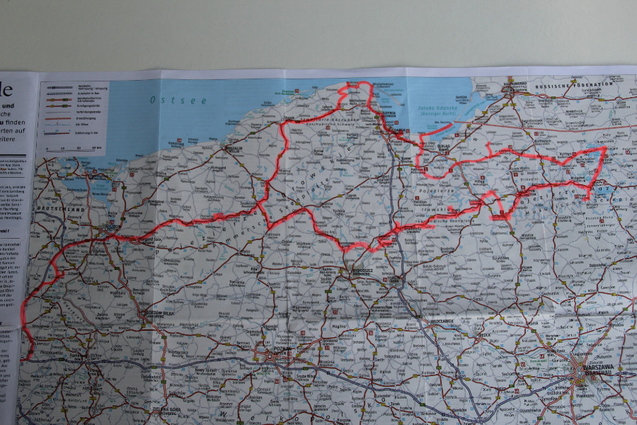 Wir waren also im Juni 3 Wochen in Polen. Bei Stettin ging es über die Grenze, dann in wenigen längeren, aber vielen kurzen Etappen bis in die Masuren.