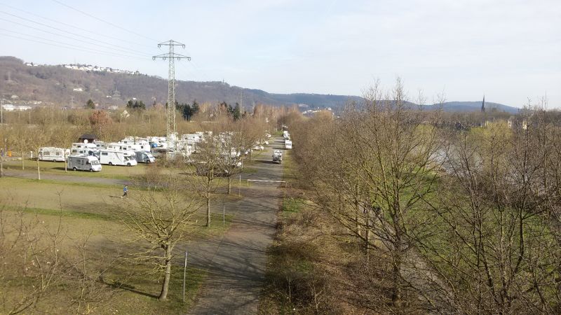 Hier noch ein Bild des Stellplatzes von der Moselbrücke aus. Die freie Fläche im Vordergrund gehört auch dazu, war aber abgesperrt - wohl damit sich die Besucher auf dem riesigen Platz nicht ganz verlieren.