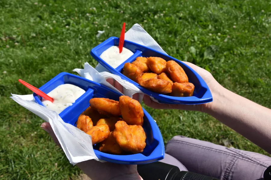 Zwei Tage war ich in München vergeblich auf der Suche nach oanem gudn Leberkäs'-Brötchen. Dann gibt's an der Küste halt leckere Kibbelinge im Schiffchen.