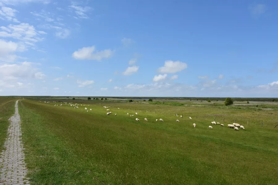 Schafe, Schafe, Schafe. Hinter dem Deich am Horizont kommt erst die Nordsee.