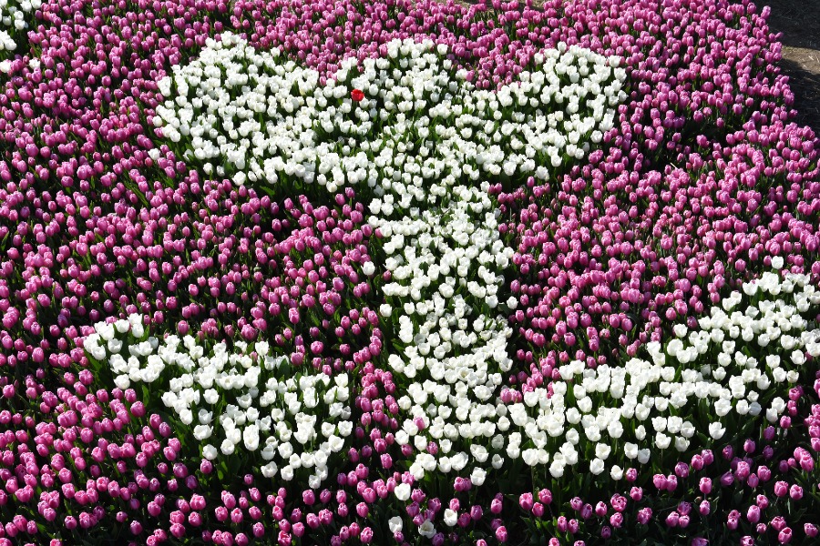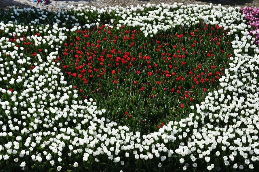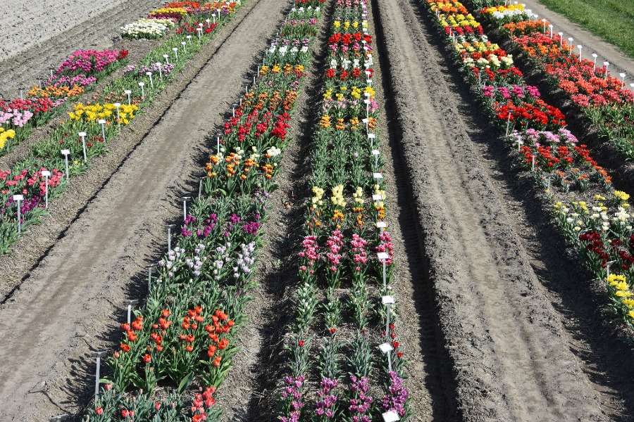 Kleine Beete mit Dutzenden von Tulpensorten bei einem Tulpenfestival im Ort Creil.