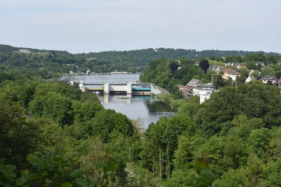 Aber trotzdem war die Tour echt gut. Hier sieht man die Ruhr im Vordergrund, das Stauwehr und den See hinter dem Stauwehr. Links oben im Bild ist die Villa Hügel zu sehen. Die Wanderung startete hinter dem Wehr und führt dann halbrechts oben aus dem Bild heraus. Über die Höhen im Hintergrund wandert man dann später von rechts nach links durch das Bild, an der Villa Hügel vorbei bis zu diesem Standort. Na ja, und dann nur noch bergab und nach rund eineinhalb Kilometern ist man wieder am Wehr.