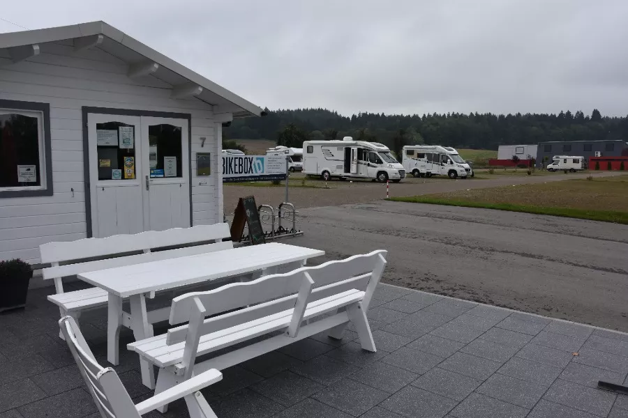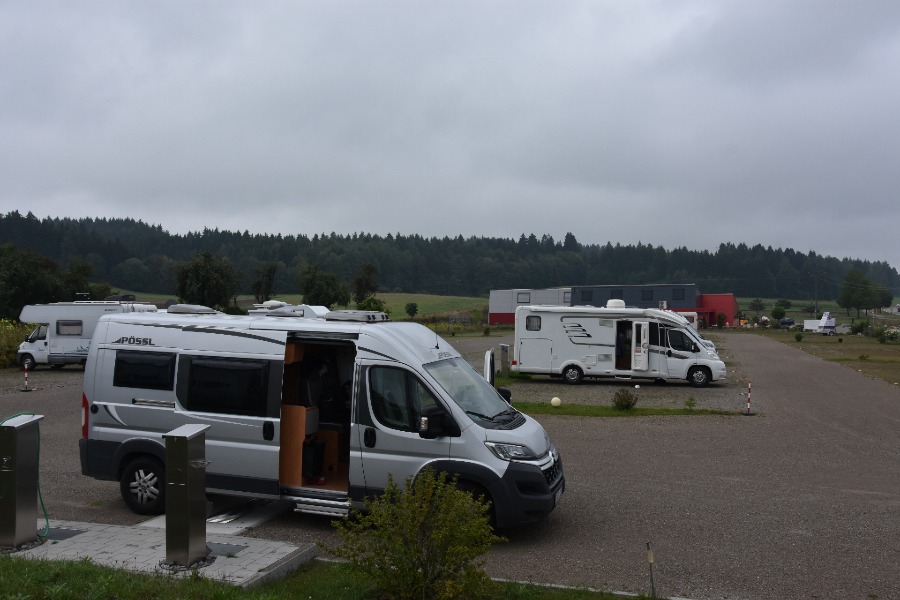 Die Plätze sind geschottert und mit Markierungen unterteilt. Aber abgesehen von Wlan und einem kleinen Anmeldehäuschen gibt es dort nichts weiter. Er liegt relativ nah an einer Straße. Daher hatten wir uns einen Platz ausgewählt, der am weitesten von der Straße entfernt ist. Dieser Platz befindet sich jedoch wiederum in einer Reihe, die einen Euro teurer ist als andere Plätze. Das hängt wiederum mit der Größe der Parzelle zusammen. Es gibt also kleine und große Parzellen. Ruhig war es aber dennoch. Kann allerdings auch sein, dass wir die Straße nicht gehört hatten, weil es lange Zeit stark regnete. Die Entsorgungsstation ist großzügig angelegt.