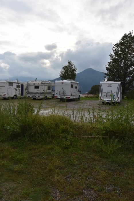 Und siehe da: Tatsächlich. In Oberau, deutlich oberhalb von Berchtesgaden wartet eine große, parzellierte Schotterfläche auf Gäste. Hierfür fährt man durch das abseits gelegene Wohnviertel und stetig bergauf. Oben angekommen sind die Stellflächen mit dem besten Ausblick auf die Berge natürlich schon belegt. Dafür steht man etwas weiter hinten mehr alleine und ruhiger.