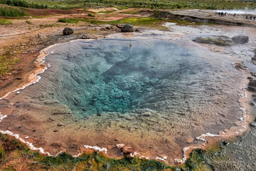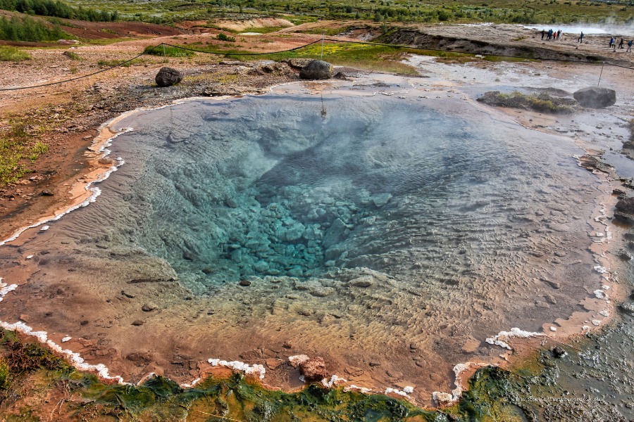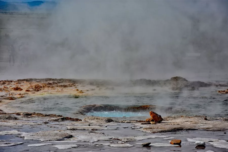 Das ist die heiße Quelle des Strokkur. Die ganze Zeit wabert das Wasser und schwappt immer wieder über. Für mich wirkte es so, als würde das Wasser "atmen", immer wieder leicht rauf und runter.
