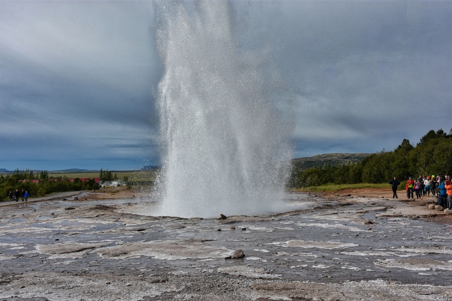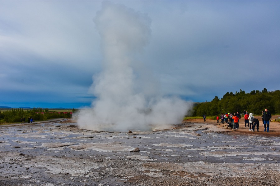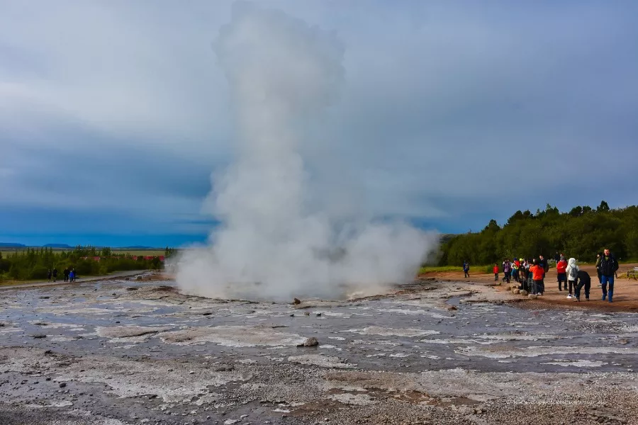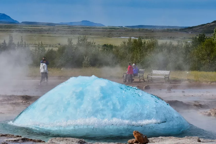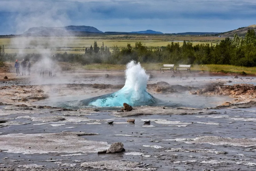 In Island gibt es den sogenannten Golden Circle. Er besteht aus drei bedeutenden Sehenswürdigkeiten, die alle zusammen ab Reykjavik in einer Tagestour gut zu schaffen sind. Daher werden diese Orte auch gerne als Tour angeboten. Zu einer der drei Punkte gehört das Geothermalfeld Haukadalur. Dort befindet sich der "Große Geysir", der jedoch nur selten ausbricht. Gleich neben der heißen Quelle des Großen Geysirs gibt es noch den Geysir Strokkur. Und der bricht alle paar Minuten aus: