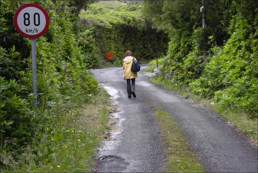 Ich beginne mit Geschwindigkeitsbeschränkungen in Irland. Das obige Foto stammt von der Westküste, aufgenommen unweit von Leenaun am Killary Harbour, der der einzige Fjord Irlands genannt wird. Es zeigt den Eingang zum Gleann na nGeimhleach (Tal der Gefangenen) an Nationalstraße 59 an der Grenze zwischen den Grafschaften Galway und Mayo.