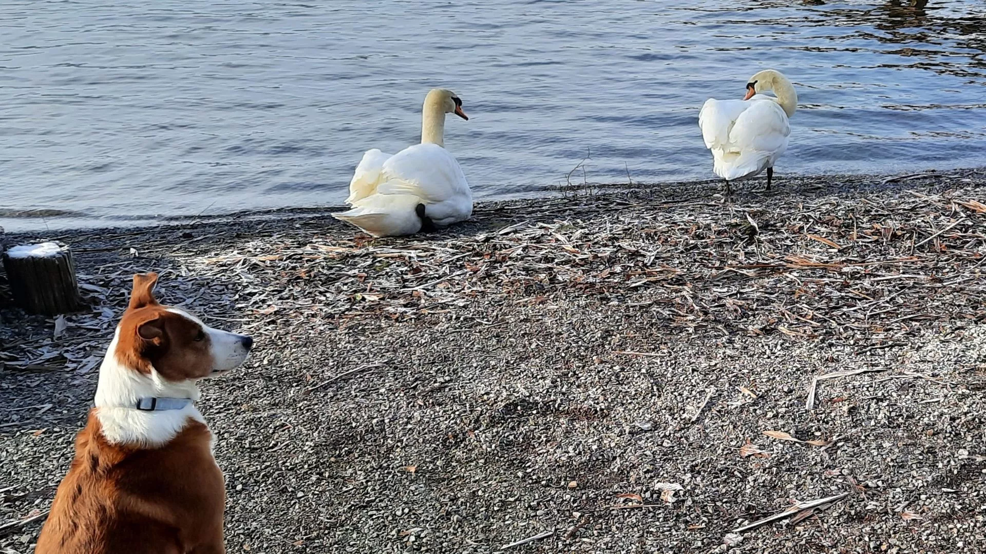 Die Schwäne blustern sich richtig auf weil wir so nahe sind und Chilka schaut absichtlich auf die Seite