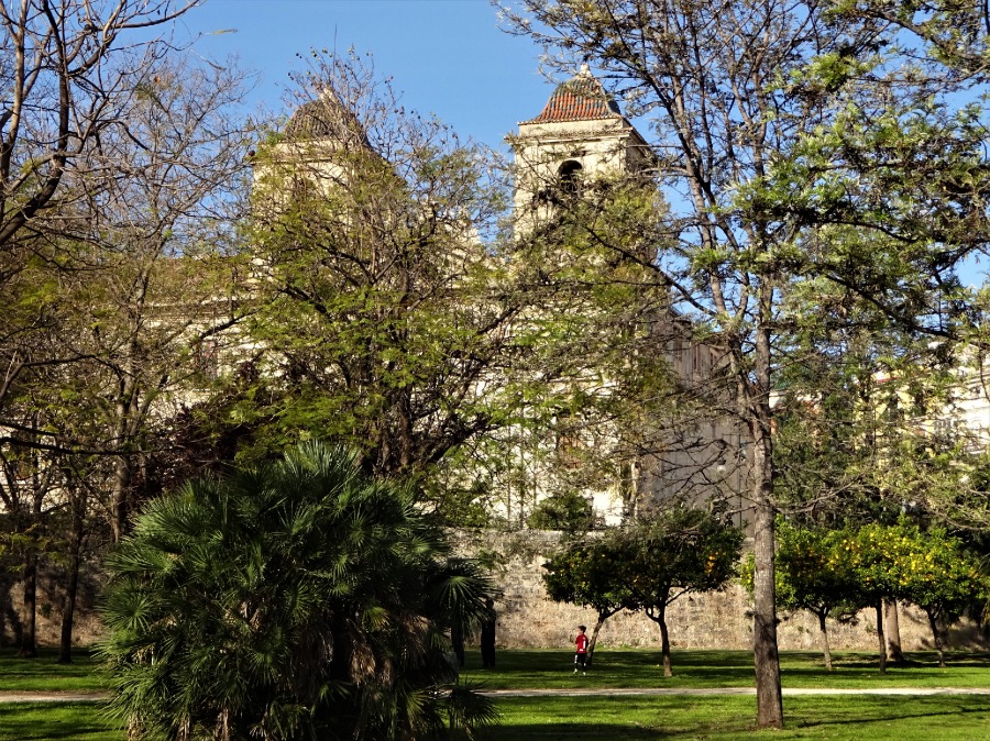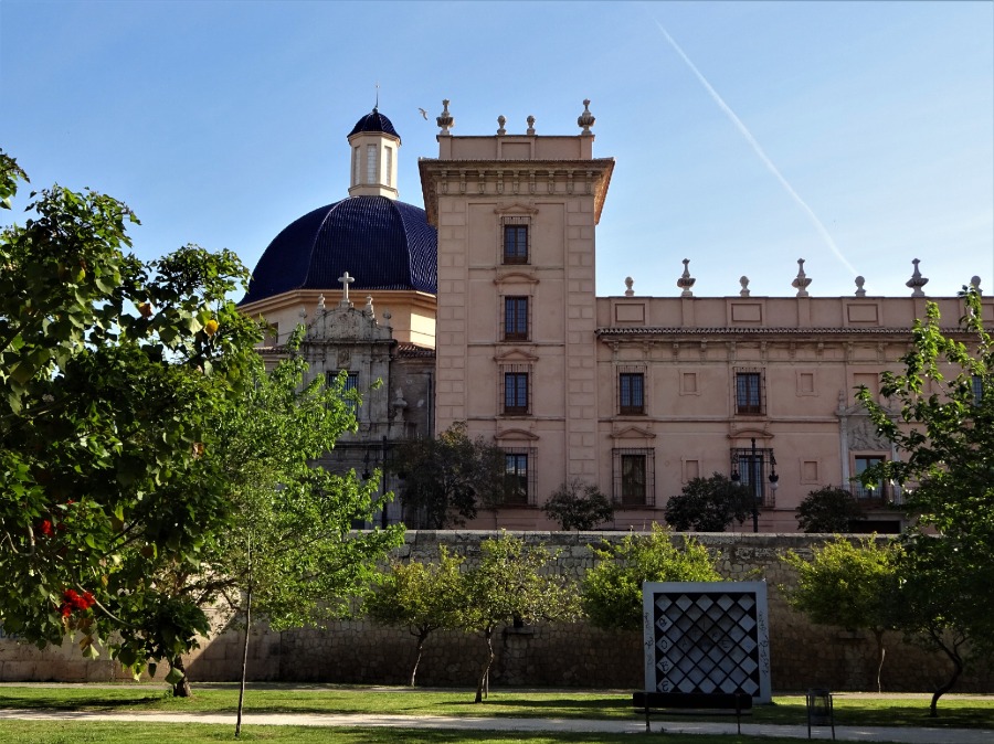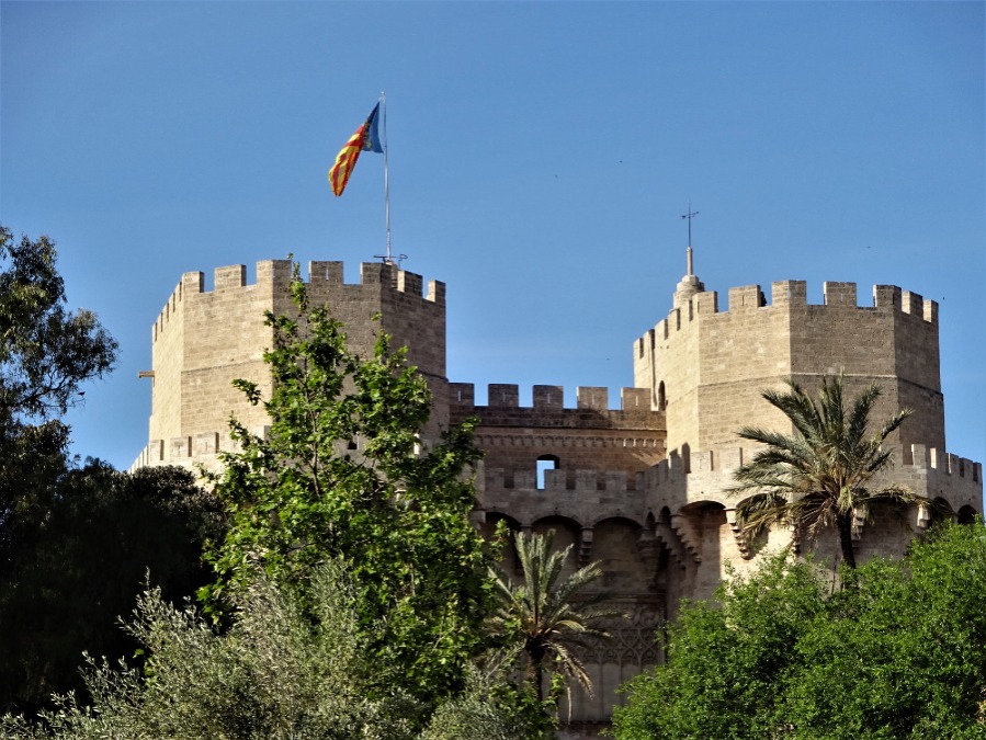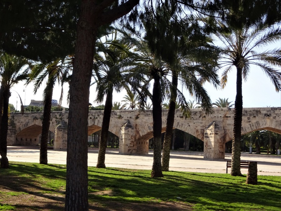 Das war früher mal ein Flussbett, dass mangels Wasser zum Park umgestaltet wurde. Das restliche Wasser fließt unterhalb und so gibt es nun viel Rasen, Blumen, Bäume, Brunnen und schattige Wege ohne Verkehr. Besonders beeindruckten uns die vielen Orangenbäume mit vielen reifen Früchten. Auf halben Weg die Puente de los Serranos, das Monestir Trinitat und Torres de Serranos.