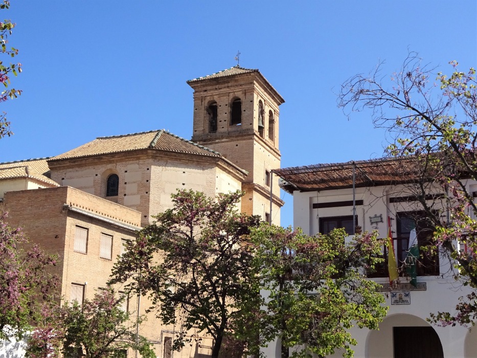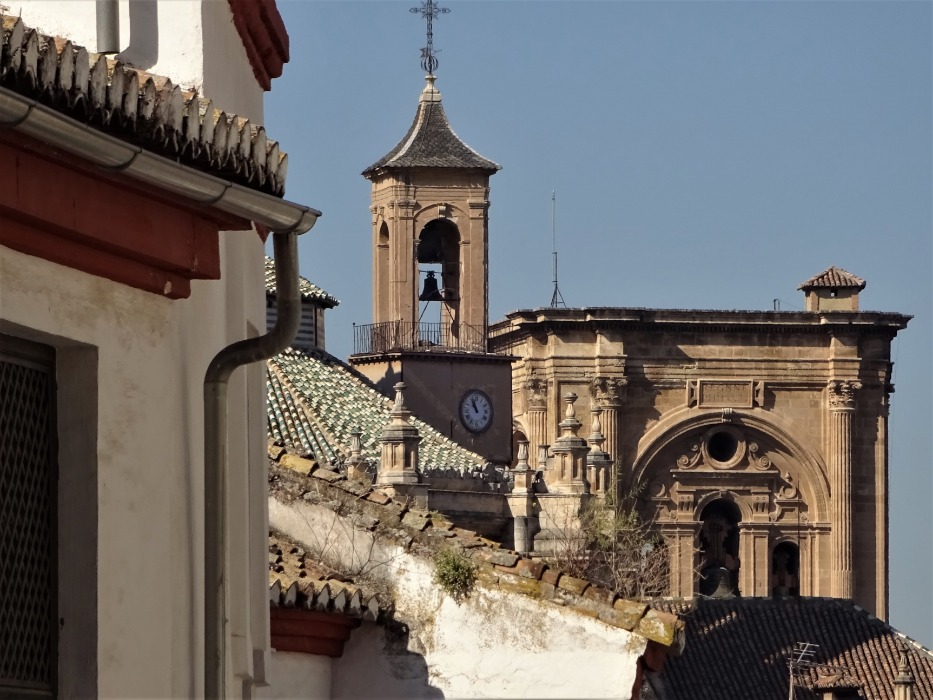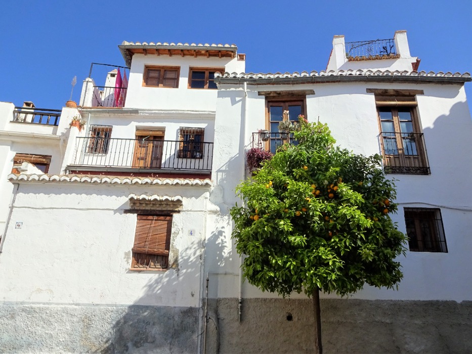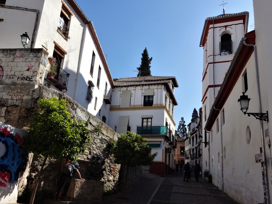 So haben wir uns entschlossen, die Gässchen und Stiegen auf der linken Flanke der Alhambra rauf zugehen. Viele sehenswerte Häuser und herrliche Gärten, Orangen und Zitronen auf den Bäumen und sehr ruhig. Und auf halber Höhe gab es einen Aussichtspunkt, wo man einen schönen Blick auf die Alhambra und der Sierra Nevada hatte. Da es so schön war, sind wir dann noch weiter geschlendert und immer wieder der Blick auf die Alhambra und Sierra Nevada. Leider wieder Gegenlicht, aber dafür eine heilige Ruhe. Danach sind wir über Steigen runter und am Bach und Gässchen entlang der Alhambra angekommen. OMG! Hier mussten wir uns einreihen, so viele Menschen waren unterwegs. Wir haben dann schnell wieder das Weite gesucht und sind abseits zum Auto gegangen.