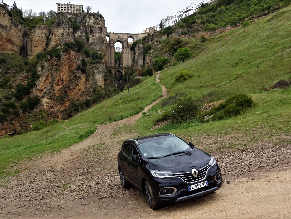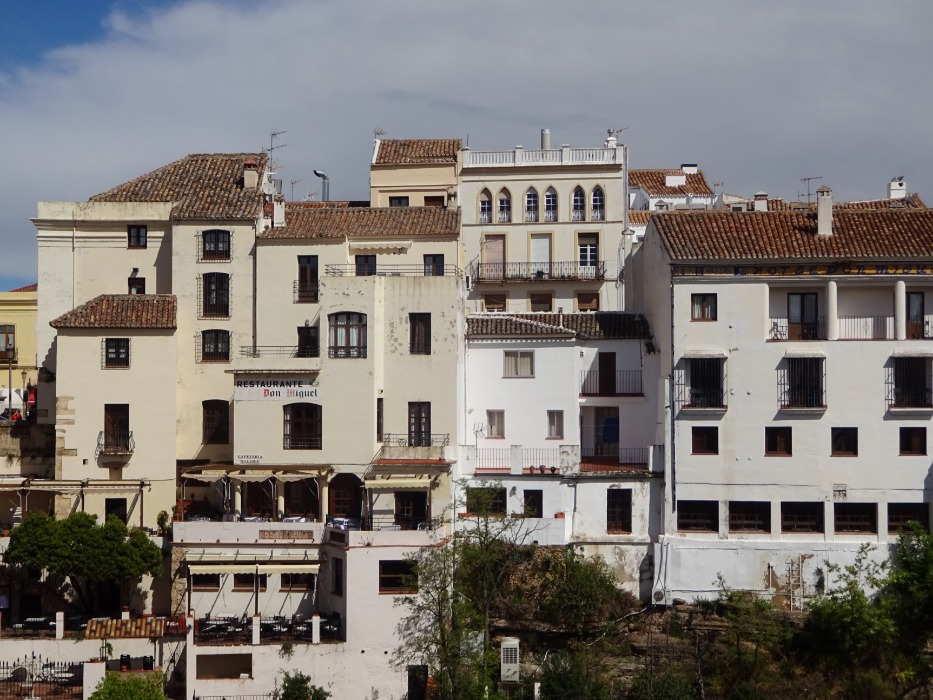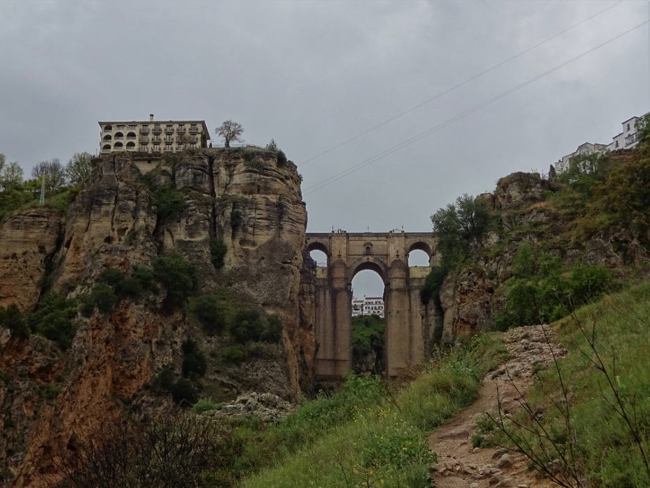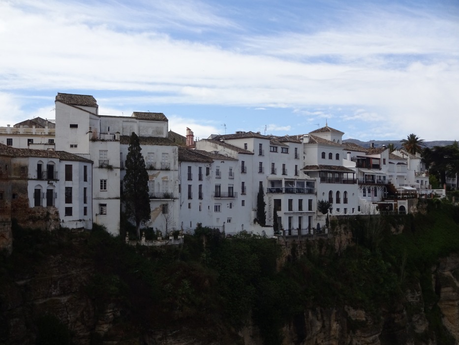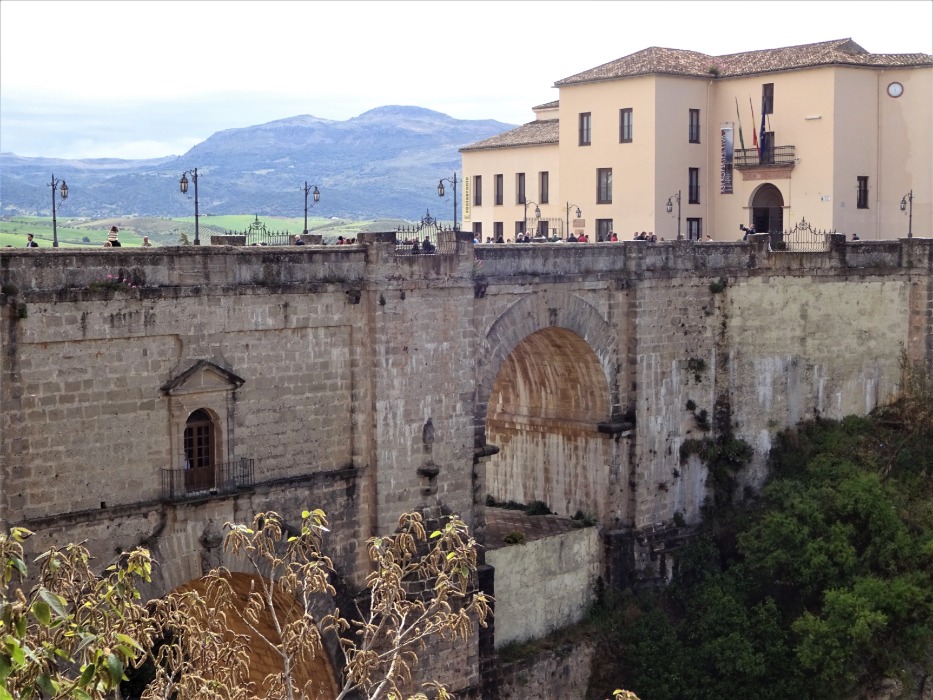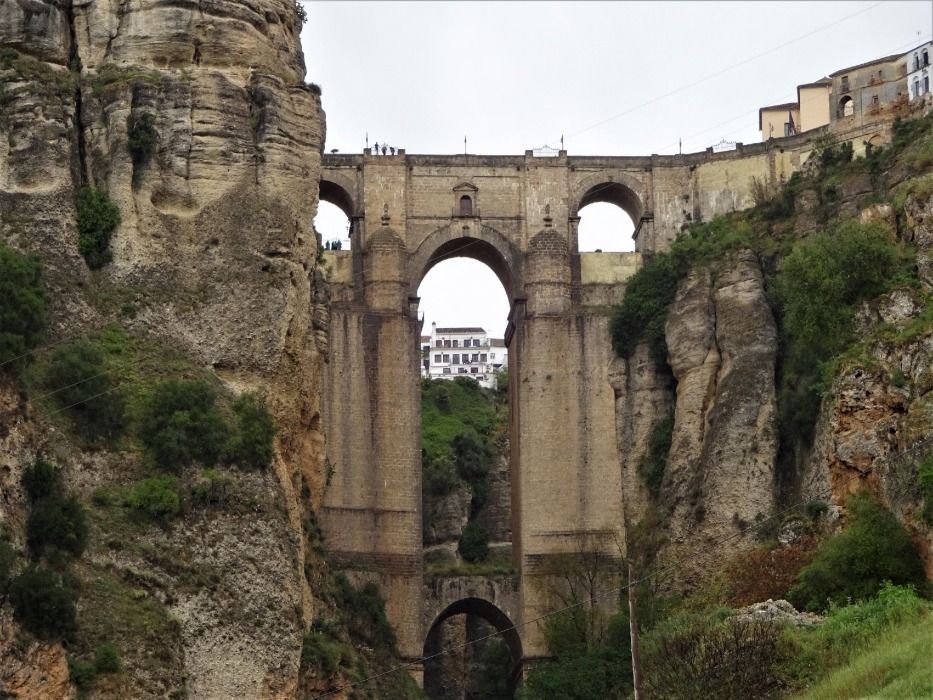 Nach der Besichtigung der Brücke von unten fuhren wir dann hoch ins Stadtzentrum. Leider darf man nur mit Sondergenehmigung über die Brücke fahren, so dass wir außen um fahren mussten. Im Zentrum haben wir gleich eine freie Parkgarage gefunden. Ein kurzer Walk durch das bezaubernde Städtchen mit vielen weißen Häusern und schon waren wir auf der Brücke, mit einem herrlichen Blick ins Land und runter in die Schlucht. Dann kamen etliche Touristenbusse und so war es für uns Zeit für die Weiterreise.