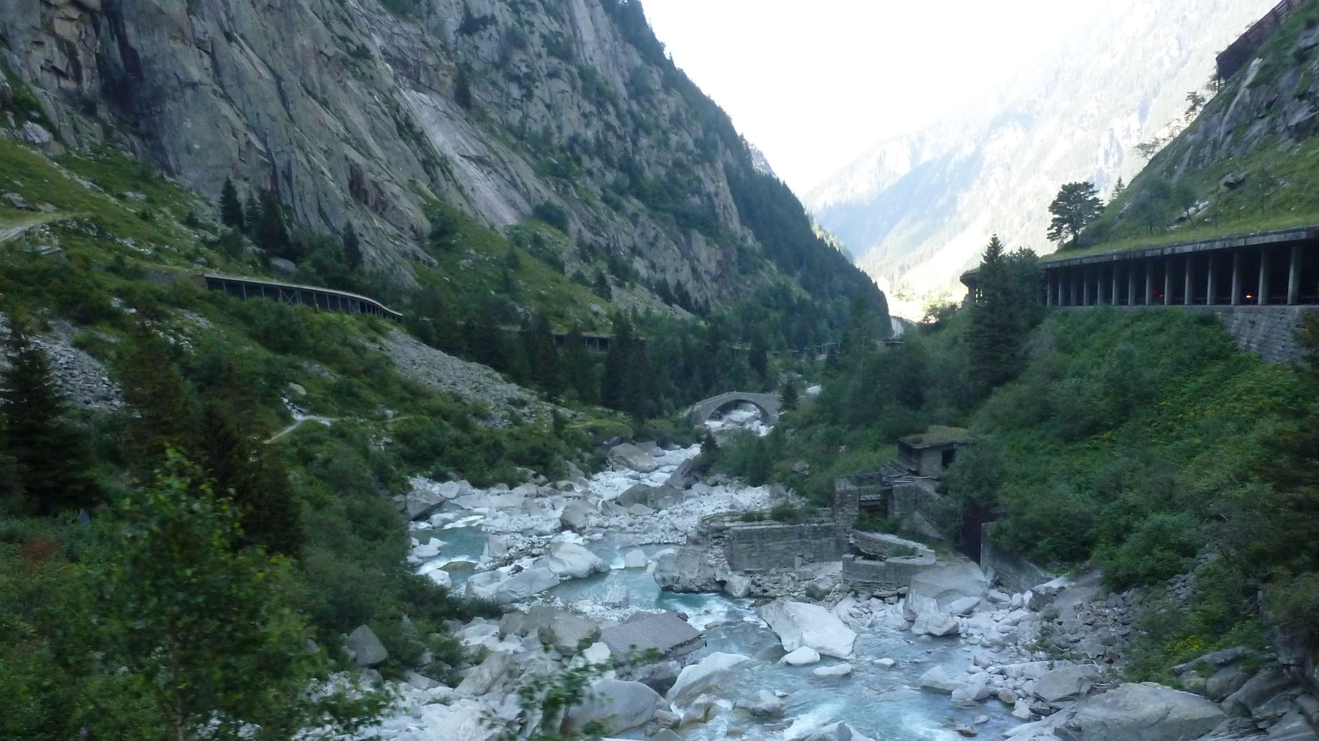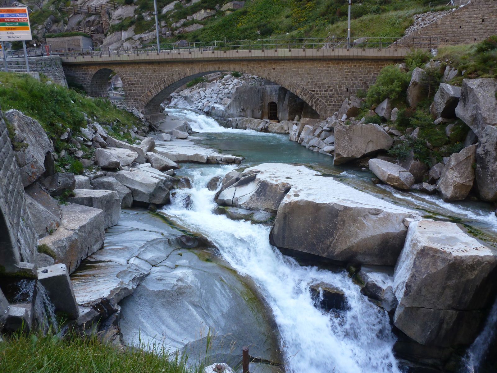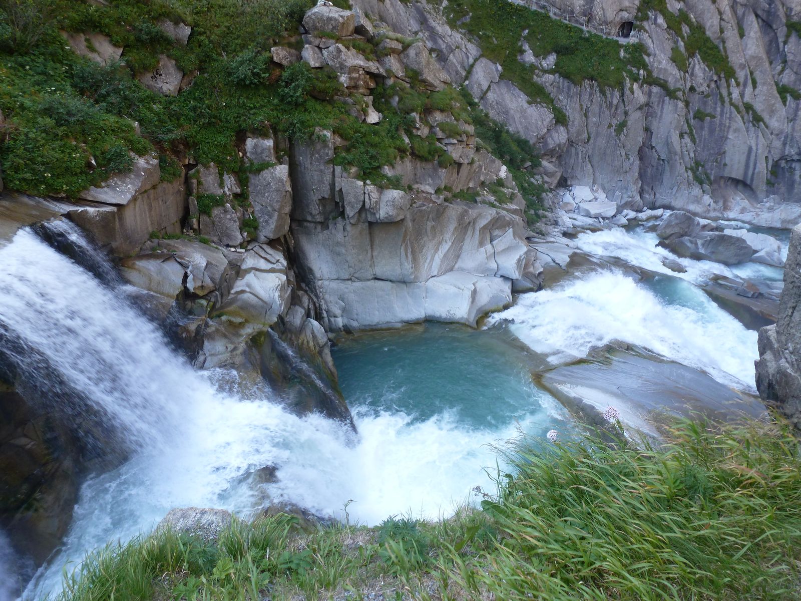 die Teufelsbrücke mit der Schöllenenschlucht am Gotthard , war Jahrelang eine Baustelle und sollte jetzt fertig sein, lohnt sich zu bewandern !!! den Tunnel mit dem Zug gehört zum Wasserfall weiter oben..... versuche noch ein Bild zu finden.