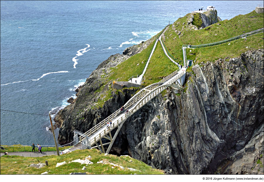 Nachdem ich hier zuletzt mit einer historischen Brücke aus dem vorletzten Jahrhundert vorstellig wurde, melde ich mich heute mit einer zurück, die gerade einmal zehn Jahre alt ist. Wir befinden uns in Irland auf der Mizen Peninsula in der Grafschaft Cork. Nach fast genau hundert Jahren wurde dort im Jahr 2009 die baufällig gewordene, zum Leuchtturm auf der Landspitze führende Brücke abgerissen und durch eine Betonkonstruktion im Hängebrücken-Look wieder aufgebaut. Die obigen Fotos entstanden im Juni 2016.
