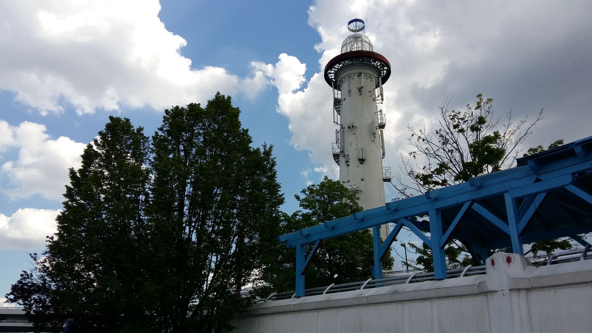 Das ist die "Ponte Cagrana" über die neue Donau in Wien. Auf der einen Seite sieht man die Partymeile "Sunken City" auf der Donauinsel mit dem Leuchtturm, auf der anderen Seite erheben sich die Wolkenkratzer des Vienna International Center, in dem die Wiener UN-Organisationen untergebracht sind.