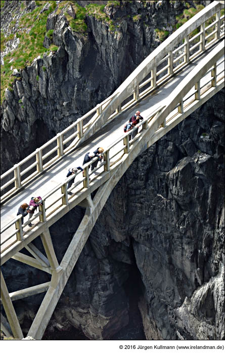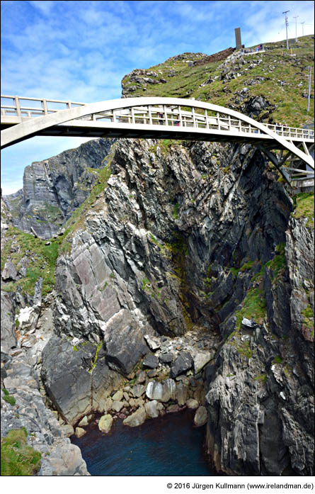 Nachdem ich hier zuletzt mit einer historischen Brücke aus dem vorletzten Jahrhundert vorstellig wurde, melde ich mich heute mit einer zurück, die gerade einmal zehn Jahre alt ist. Wir befinden uns in Irland auf der Mizen Peninsula in der Grafschaft Cork. Nach fast genau hundert Jahren wurde dort im Jahr 2009 die baufällig gewordene, zum Leuchtturm auf der Landspitze führende Brücke abgerissen und durch eine Betonkonstruktion im Hängebrücken-Look wieder aufgebaut. Die obigen Fotos entstanden im Juni 2016.