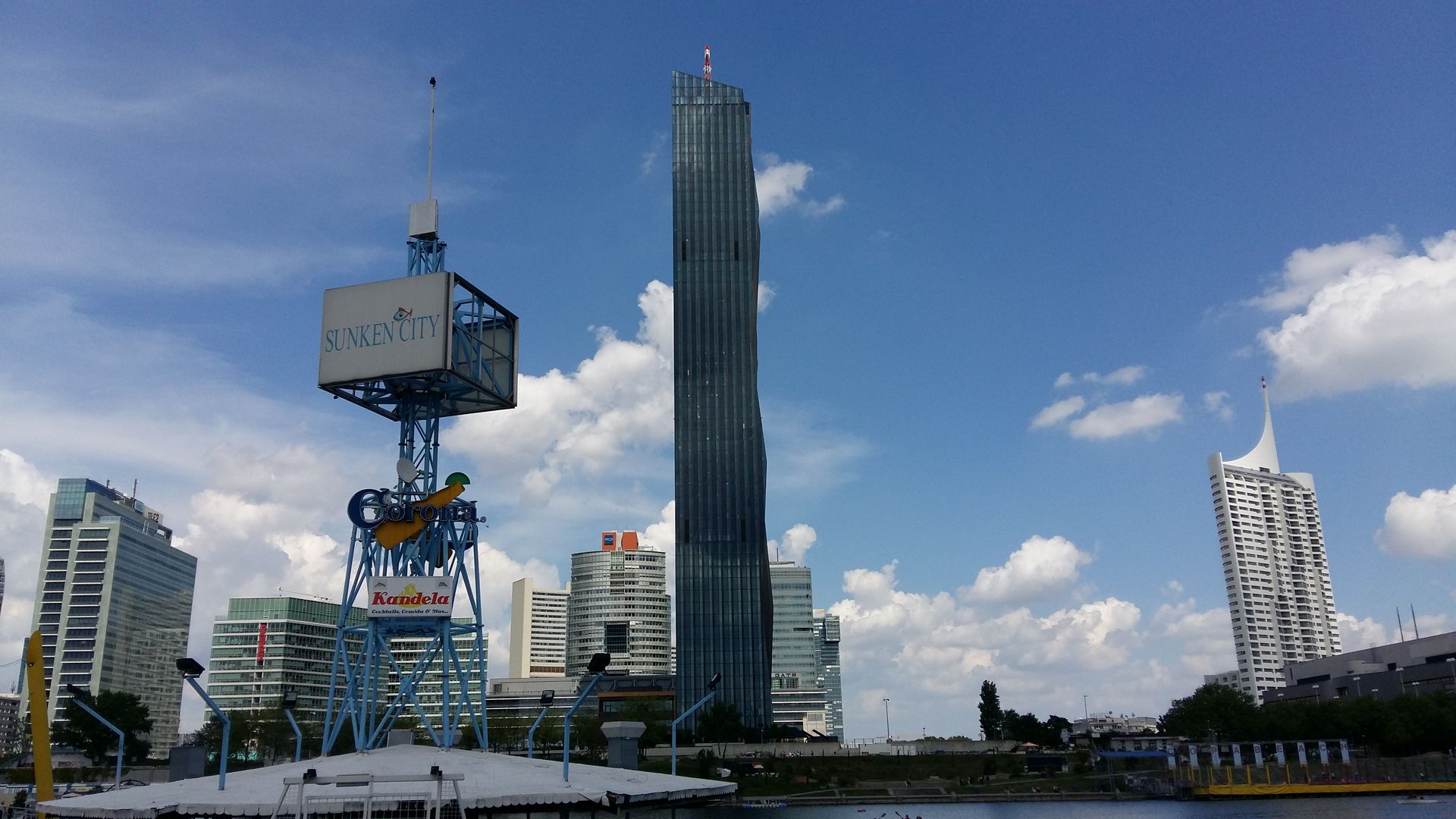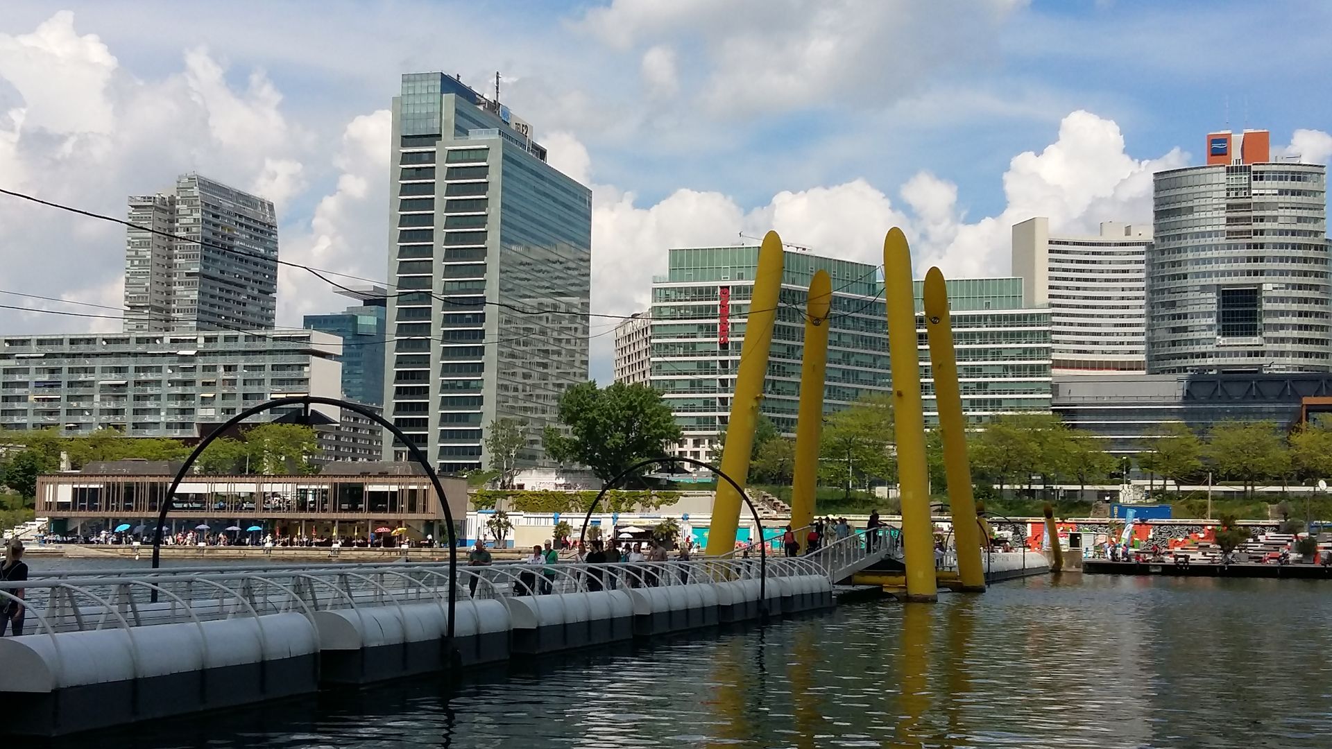 Das ist die "Ponte Cagrana" über die neue Donau in Wien. Auf der einen Seite sieht man die Partymeile "Sunken City" auf der Donauinsel mit dem Leuchtturm, auf der anderen Seite erheben sich die Wolkenkratzer des Vienna International Center, in dem die Wiener UN-Organisationen untergebracht sind.