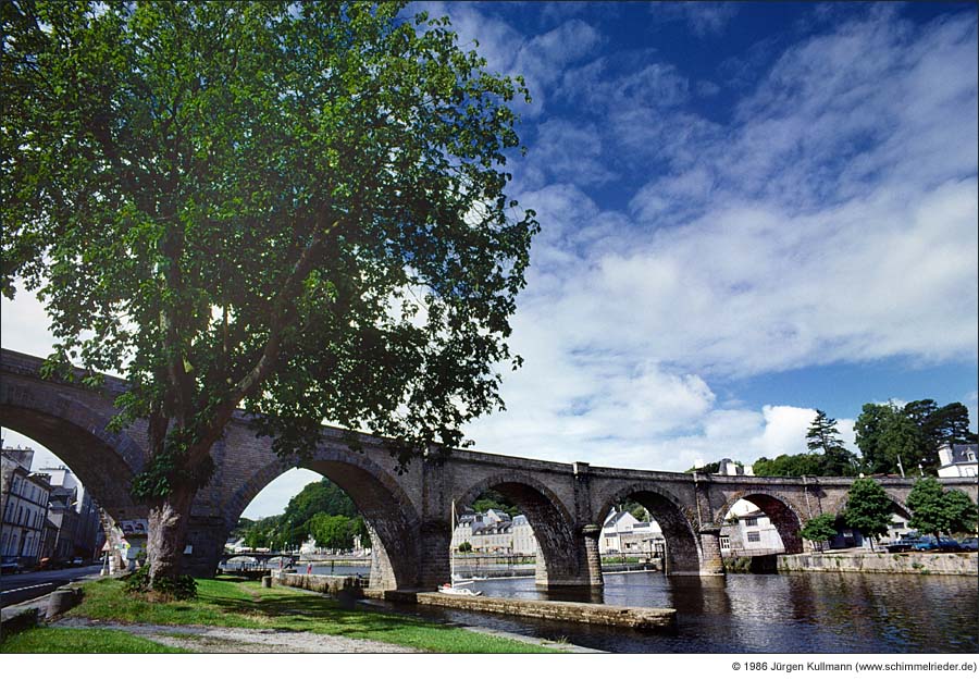 Auch als Viaduc de Châteaulin bekannt, wurde die Brücke, an der wir im August 1986 auf unserem Weg in die Bretagne einen Halt eingelegt hatten, im Jahr 1907 eingeweiht. Ursprünglich eine Eisenbahnbrücke, dient sie heute dem Straßenverkehr. Das in einem leichten Bogen über den Fluss führende, aus Granit und gelbem Sandstein erbaute Viadukt ist knapp 190 Meter lang. Vier der sechs Steinbögen führen über das Wasser.