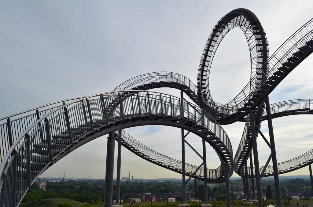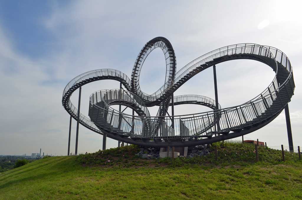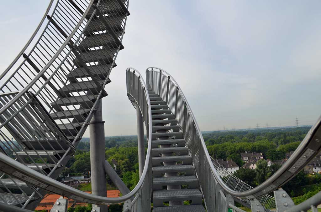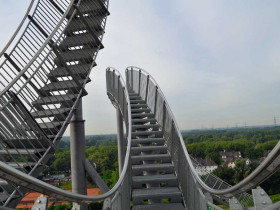 Im Grunde handelt es sich um eine begehbare Skulptur, die wie ein Achterbahn geformt ist und auf der man über zahllose Stufen auf- und abwandert. Und wer wissen will, wie man zu Fuß den Looping bewältigt: