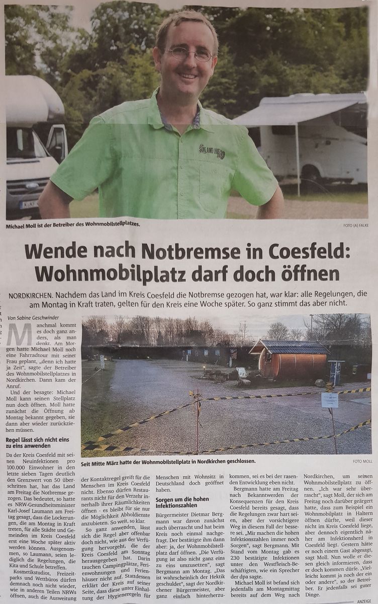Schnell mussten wir noch unsere vorbereiteten "Bitte Abstand halten"-Zettel und dergleichen laminieren und dann ging es ruckzuck zum Stellplatz. Gleichzeitig bei Instagram und Facebook ein erstes Posting abgesetzt, dass wir öffnen dürfen. Kaum ins Auto eingestiegen, riefen die Ruhrnachrichten an. Hatten das Instagram-Posting gesehen und wollten kurz ein paar Infos.