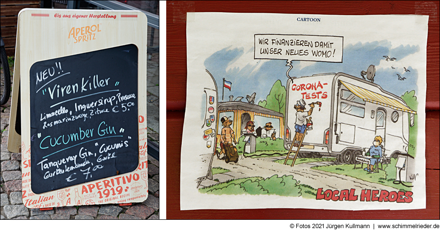 Das linke Foto habe ich in der vergangenen Woche vor einem Restaurant an der Husumer Hafenmeile fotografiert, das rechte an der Innenwand eines Unterstandes in der Nähe eines Corona-Testzentrums und Wohnmobil-Stellplatzes. Eine Idee vielleicht auch für andere Womo-Besitzer?