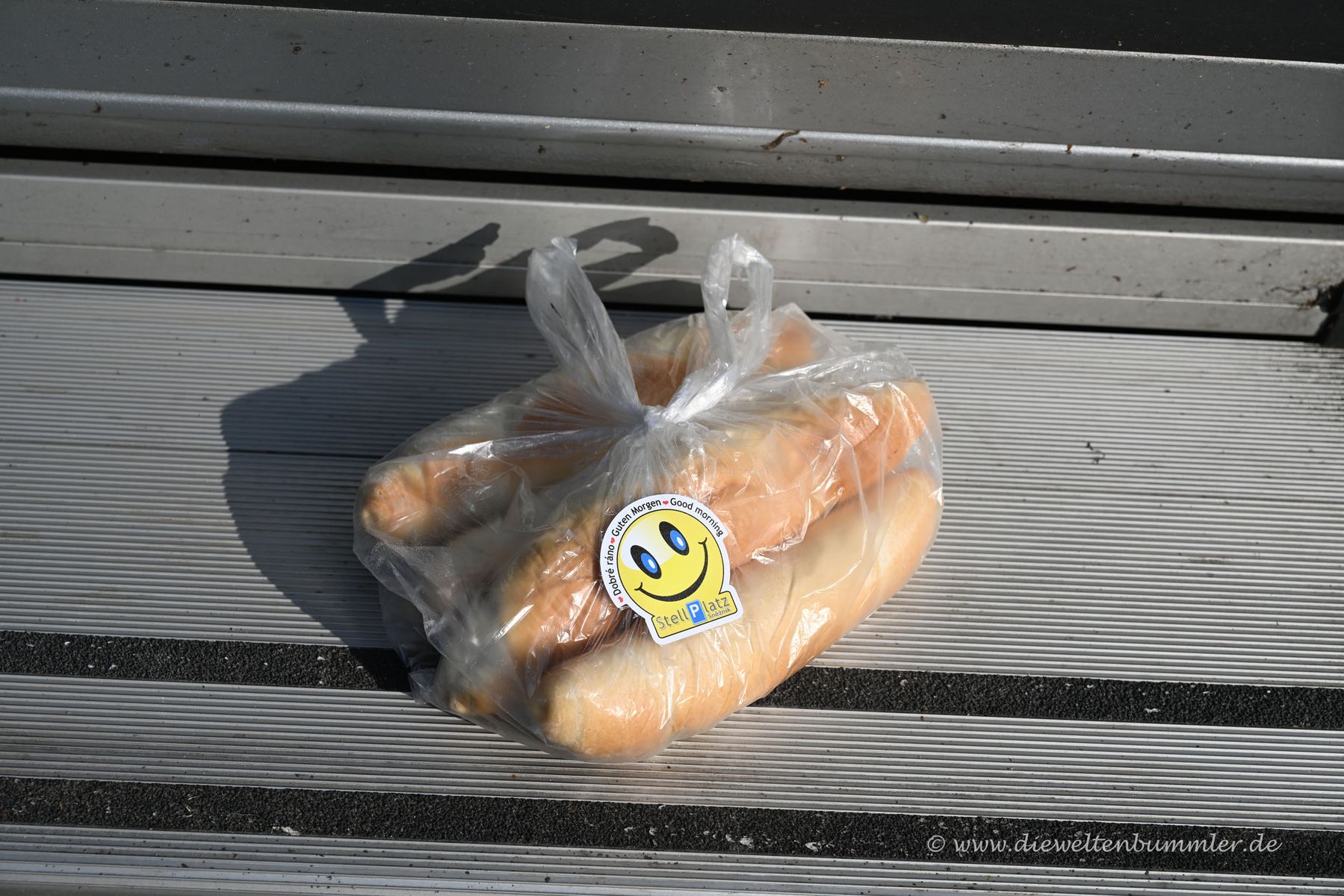 Aber der Clou des Stellplatzes ist der Brötchenservice. Jeden Morgen lagen vier typische tschechische Brötchen auf der Trittstufe (oder hingen am Spiegel). Einfach so...