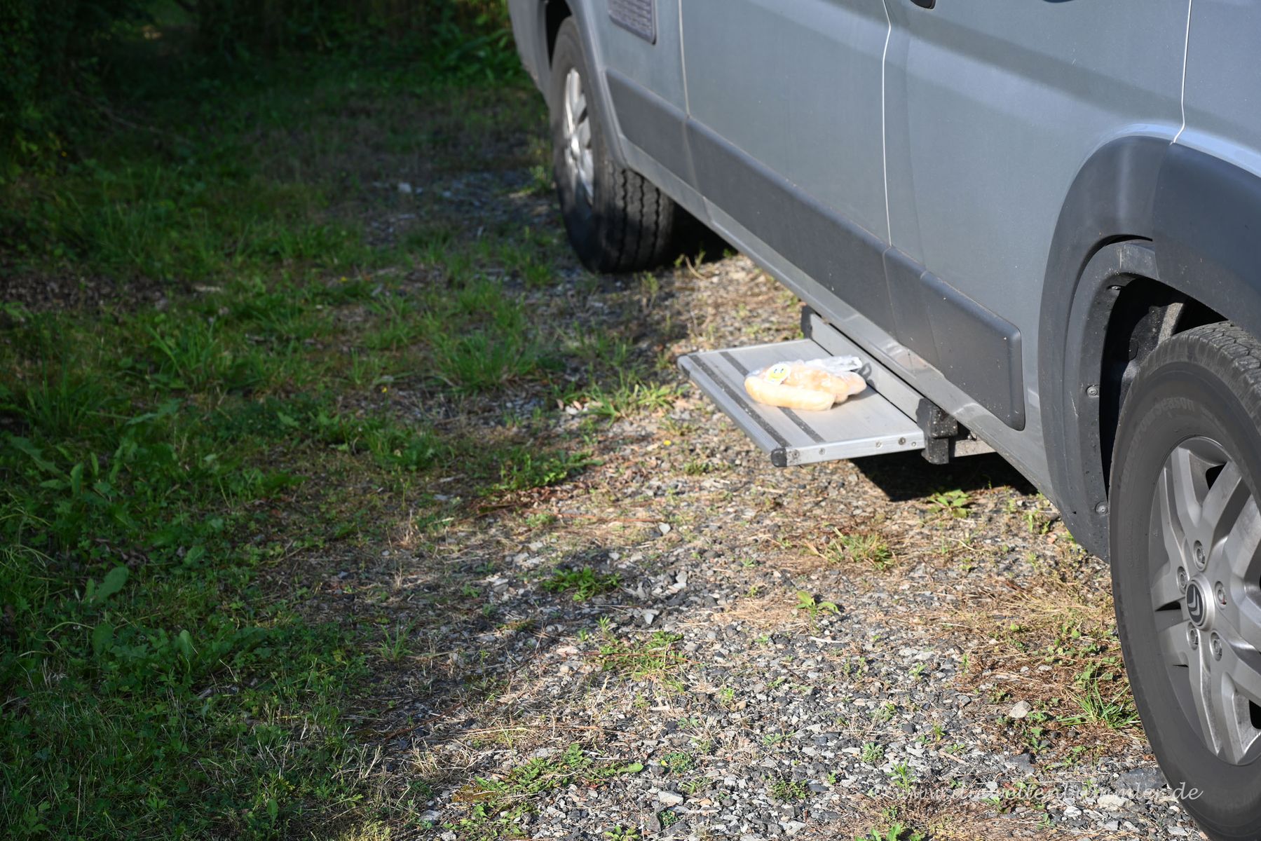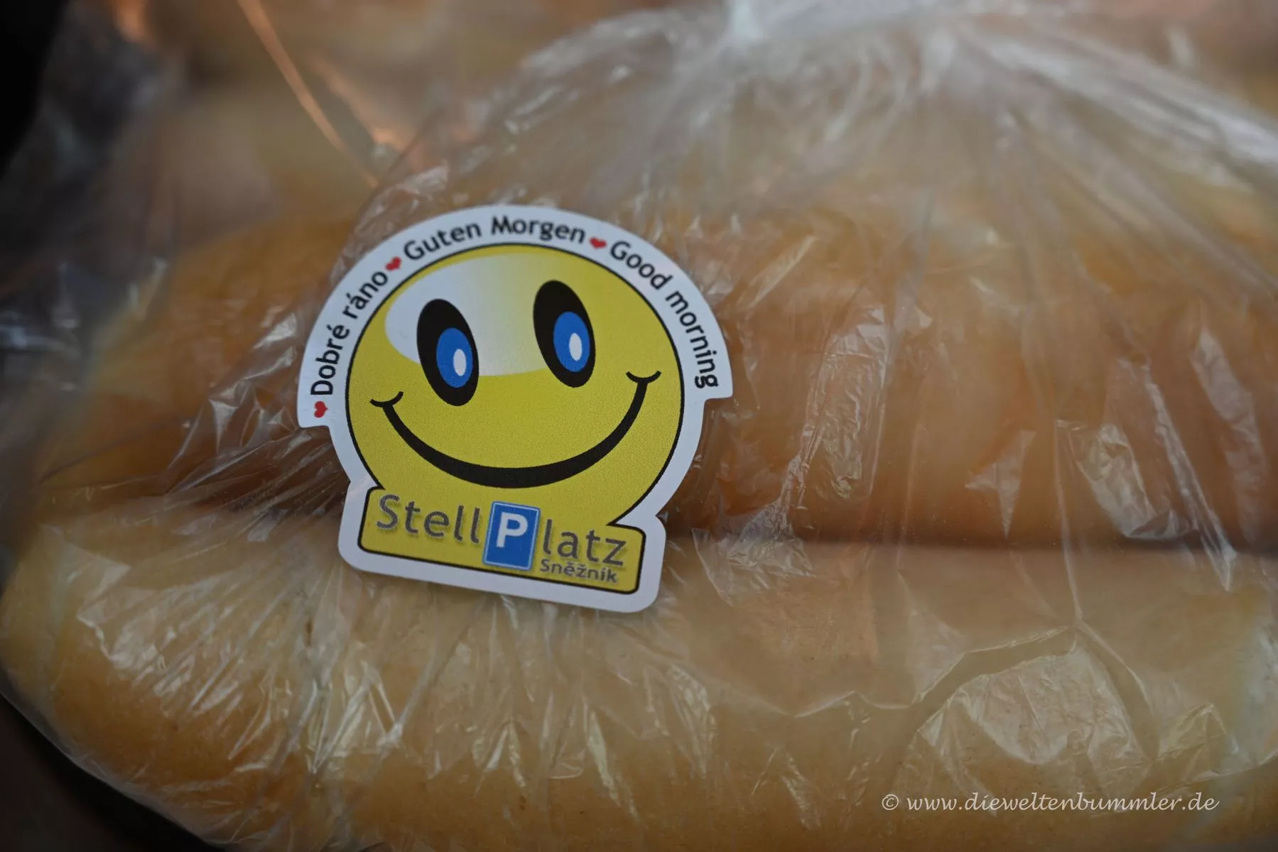 Aber der Clou des Stellplatzes ist der Brötchenservice. Jeden Morgen lagen vier typische tschechische Brötchen auf der Trittstufe (oder hingen am Spiegel). Einfach so...
